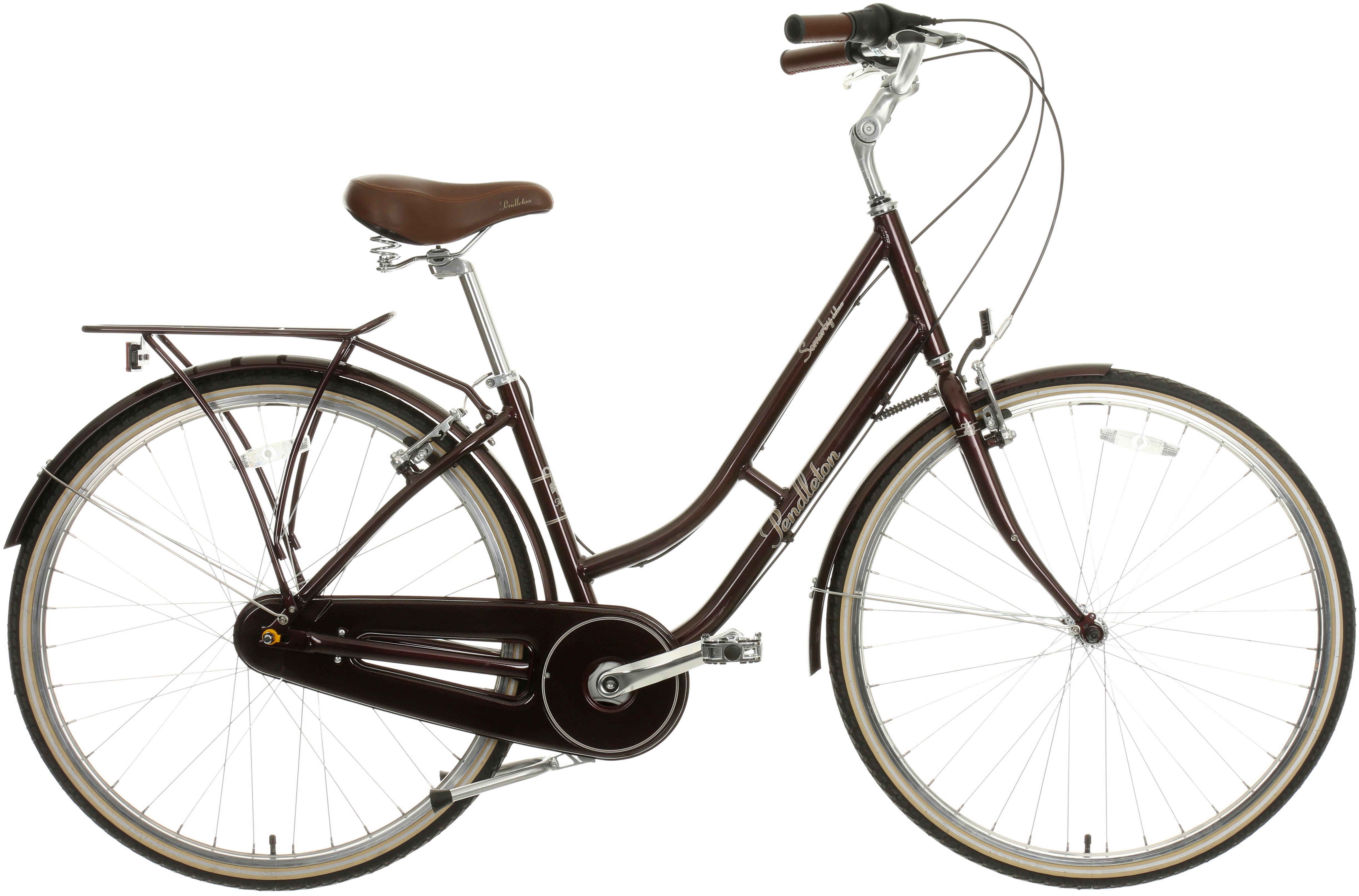 The Pendleton Somerby Deluxe Hybrid Bike - Plum will get everyone's attention as you cycle by, it is the epitome of style coupled with a classic design. With a classic step-through frame to make hopping on and off easy, the beautiful Somerby deluxe has a sprung leather-style saddle for comfort with 8 speed Shimano gearing to help you up hills.