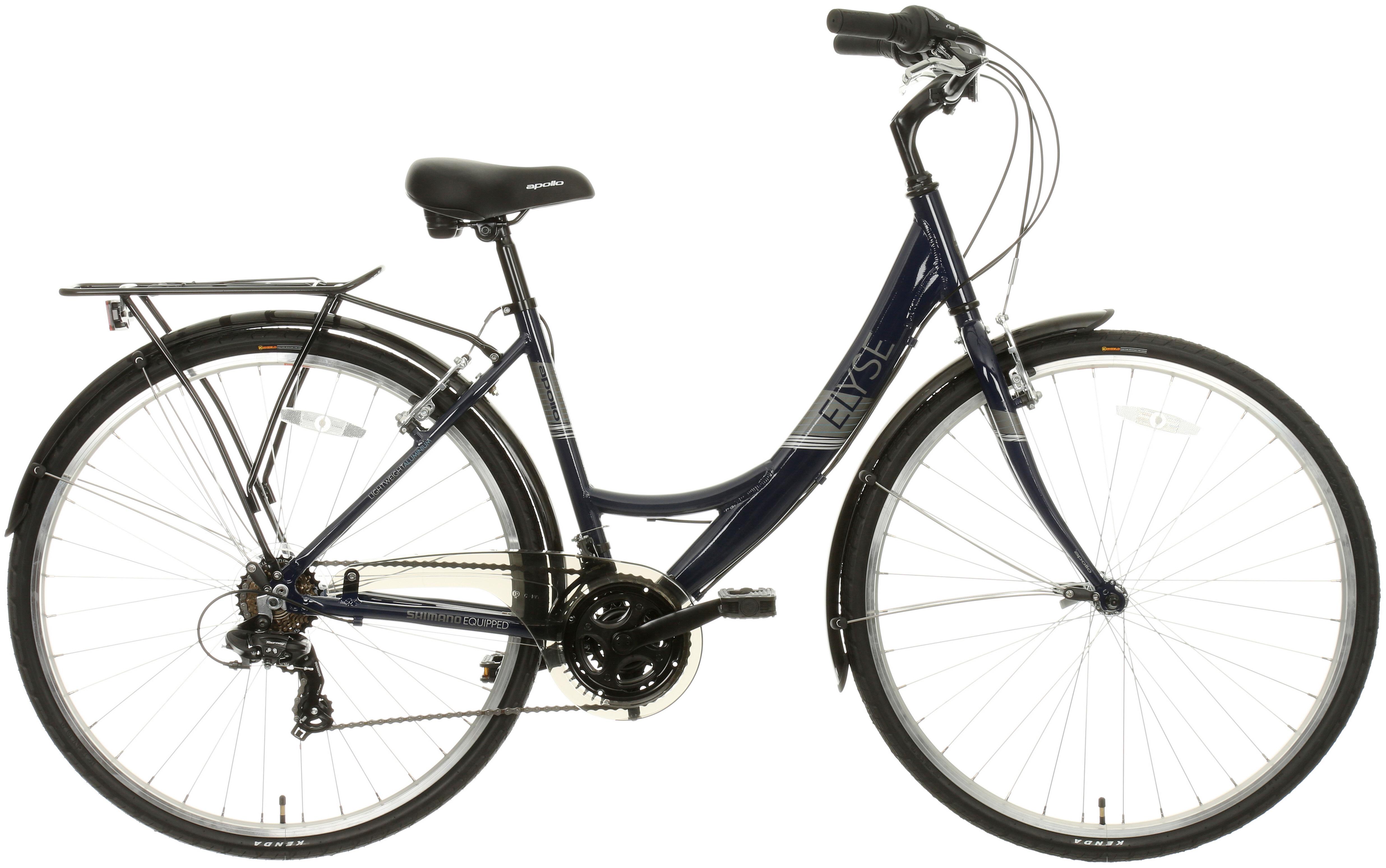 The stylish and handy Apollo Elyse Womens Hybrid Bike - Navy - 16" is a hybrid bike that provides everything you need, whether it’s roaming around the countryside or making your daily commute, the Elyse has it all; It's 21-speed Shimano gears ensure any hills you may face will be a breeze.