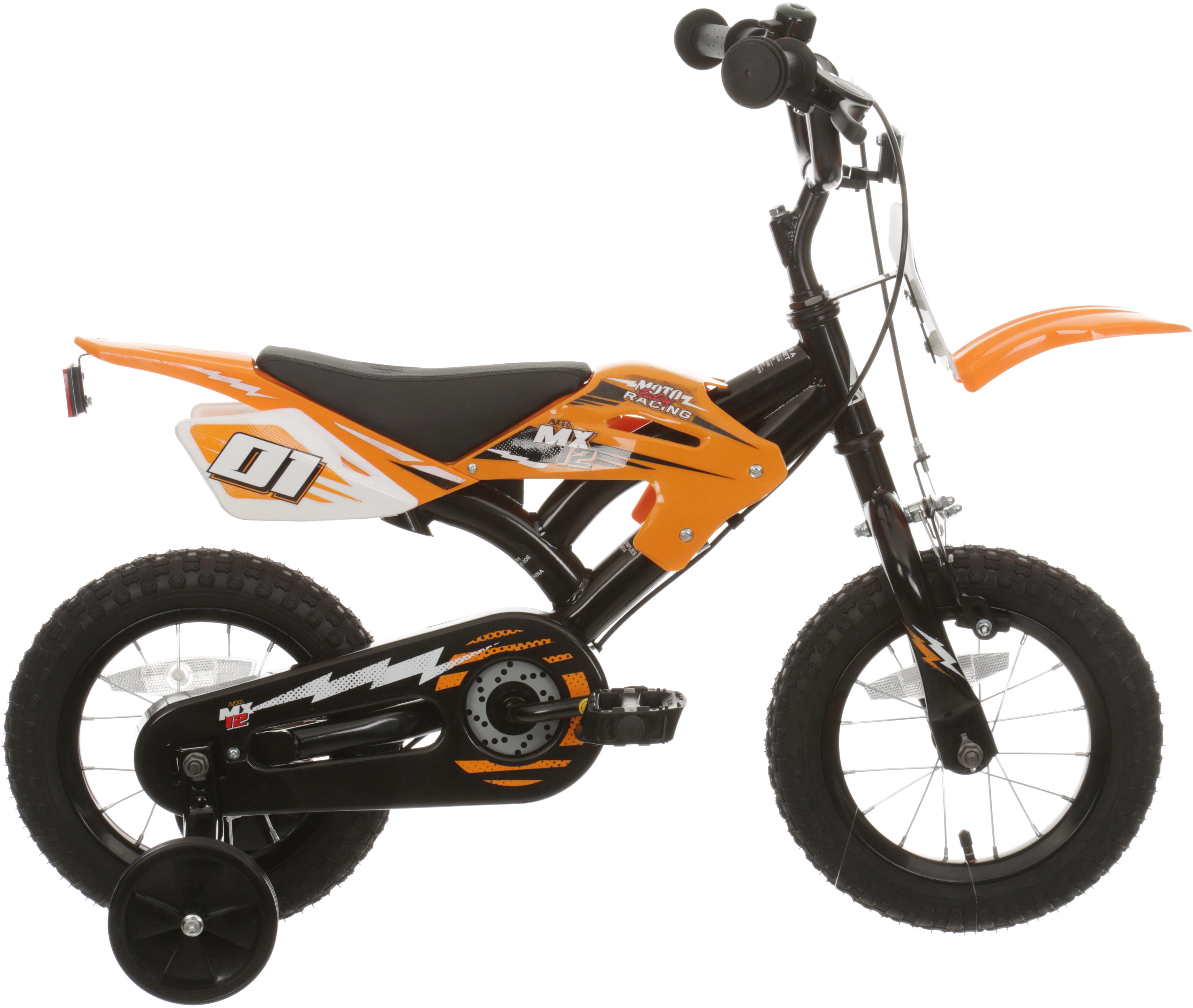 The Motobike MX12 is loaded with safety features including: a fully enclosed chainguard (to stop little fingers getting to the chain), removable stabilisers, front and rear high visibility wheels reflectors, plus a handlebar mounted bell. The adjustable handlebars and cool racing number are mounted to the robust steel frame and adjustable handlebars. Comes with Full Motocross Body Kit.
