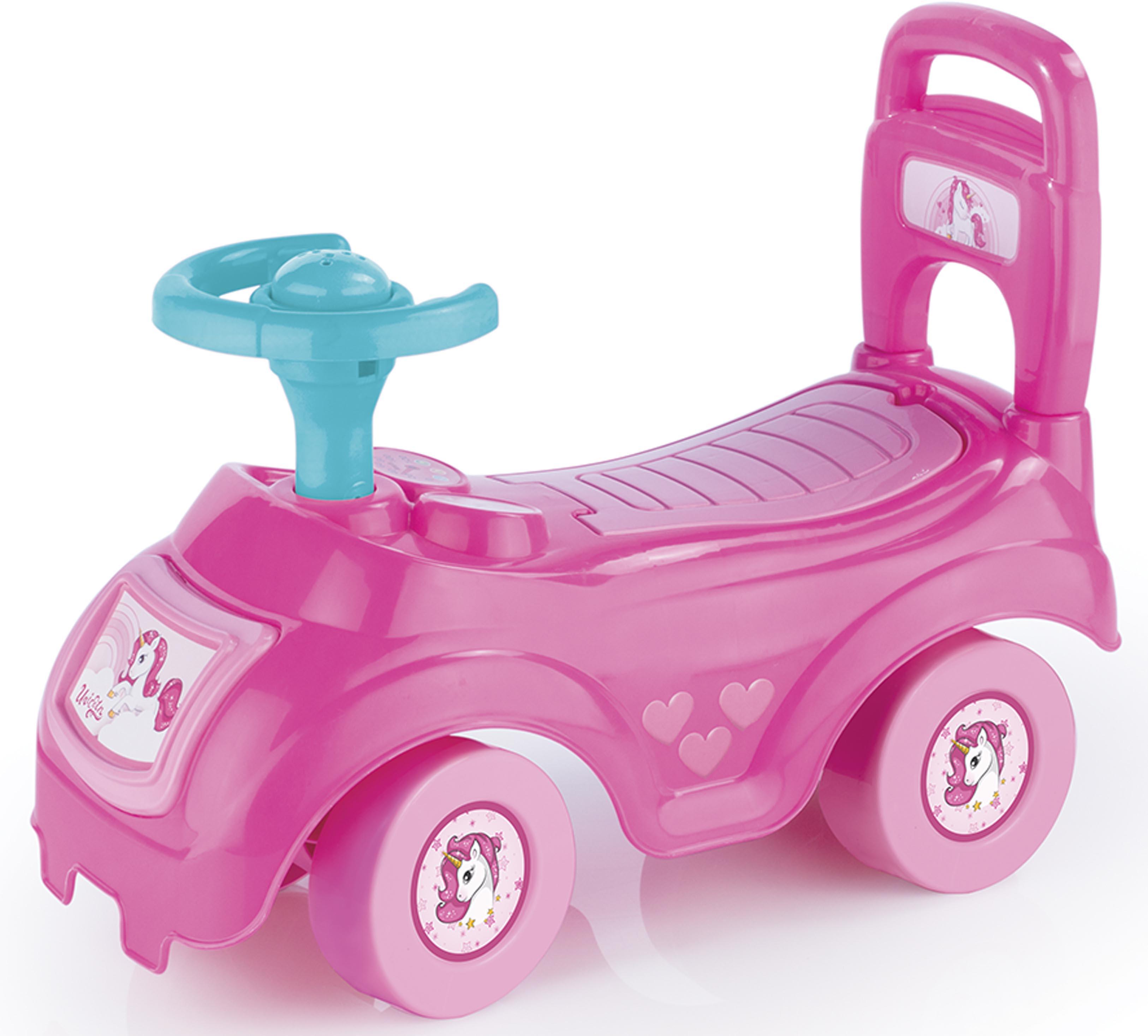 This Unicorn sit ‘n’ ride car can be used as a push-along to aid them on their first steps, to sit and ride using foot power, whilst steering their way, using the squeaky horn to beep. The ride-on car has a built-in storage box under the seat for the child to take their favourite toys along with them. Dimensions 48 x 21 x 37 cm. Suits ages 12 months plus.