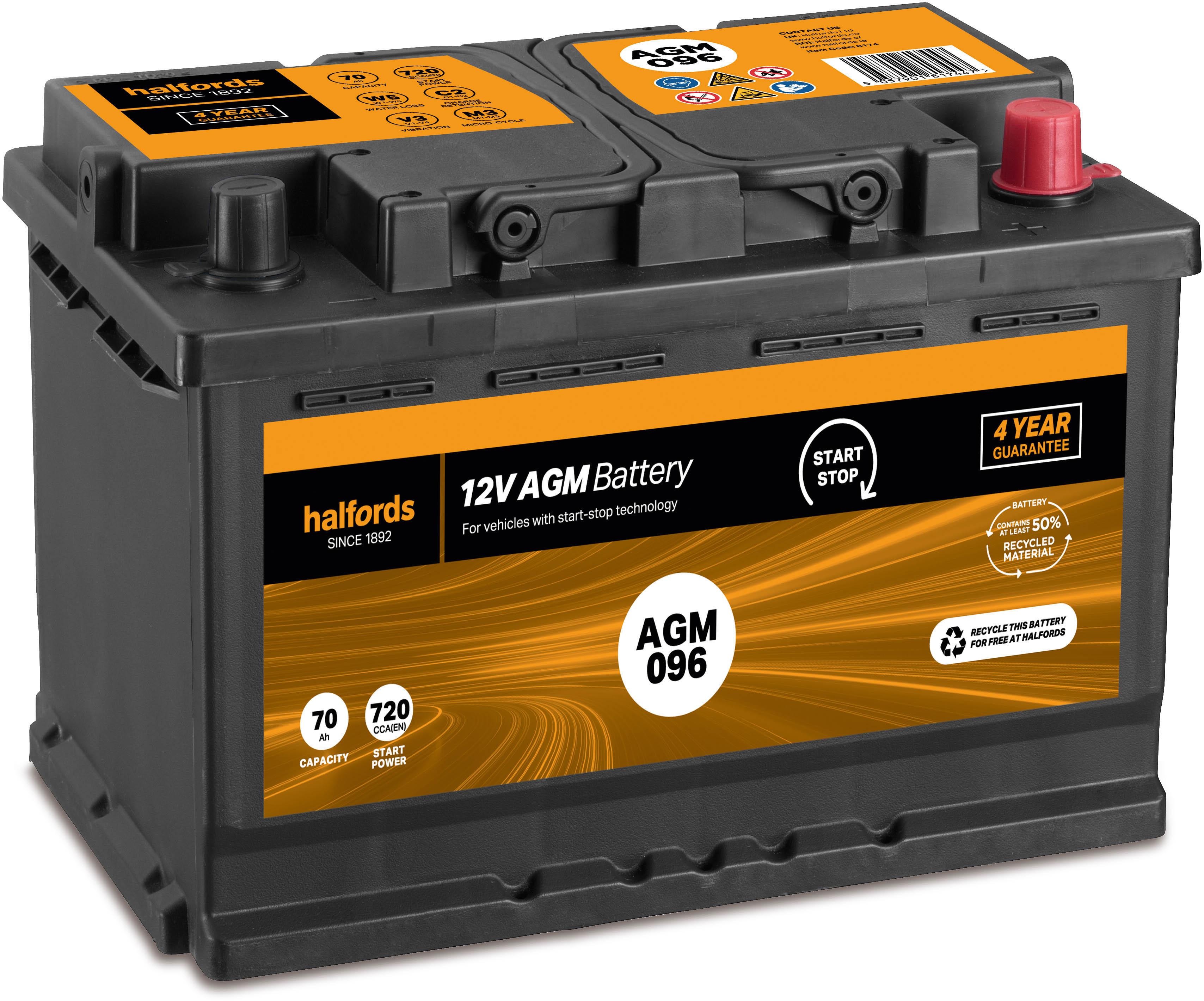 For vehicles with start/stop technology or regenerative braking, the Halfords AGM096 Battery maximises your efficiency, and gives you up to 360,000 engine starts for reliable motoring.
