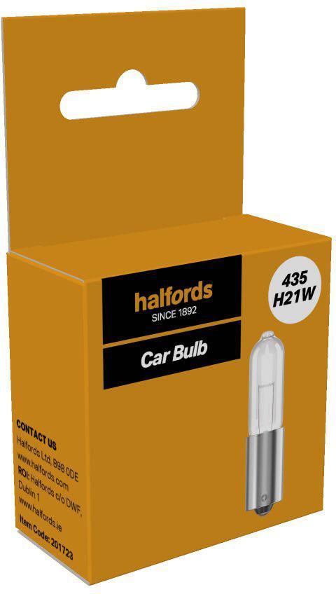 Halfords 435 H21W Car Bulb, developed to ECE regulation 37. Provides reliable performance and light output. The bulb is suitable for brake, indicator, reverse or rear fog. It’s E-marked for road legal use in the UK and Europe.