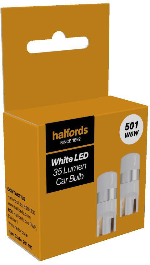 Halfords 501 W5W white LED car bulb. Suitable for side, tail, panel and interior. Provides reliable performance and light output. Suitable for off-road or interior use only.