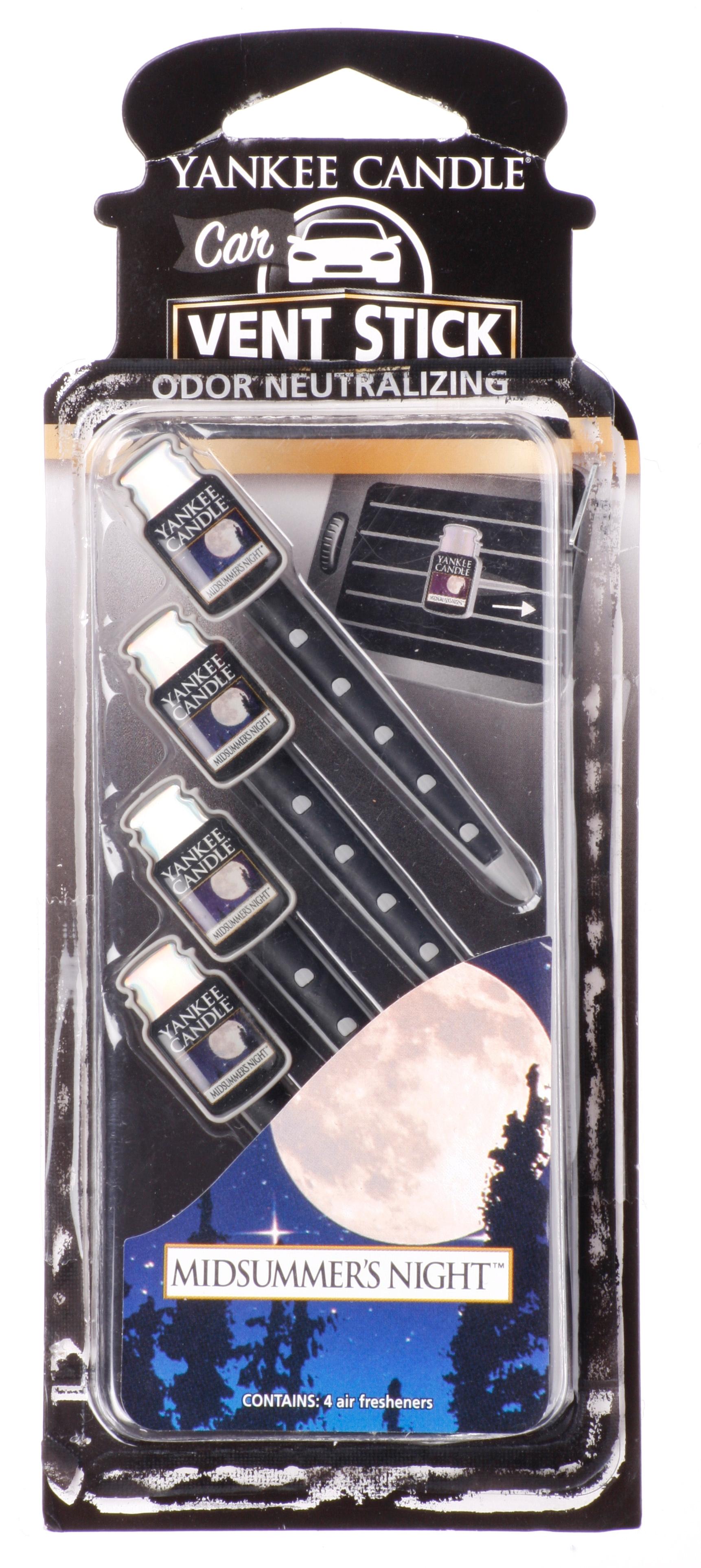 The Yankee Candle Car Air Freshener Midsummer's Night Vent Sticks - Pack of 4 is an intoxicating and masculine blend of musk, patchouli, sage and mahogany cologne. Simply attach these in any vehicle air vent.
