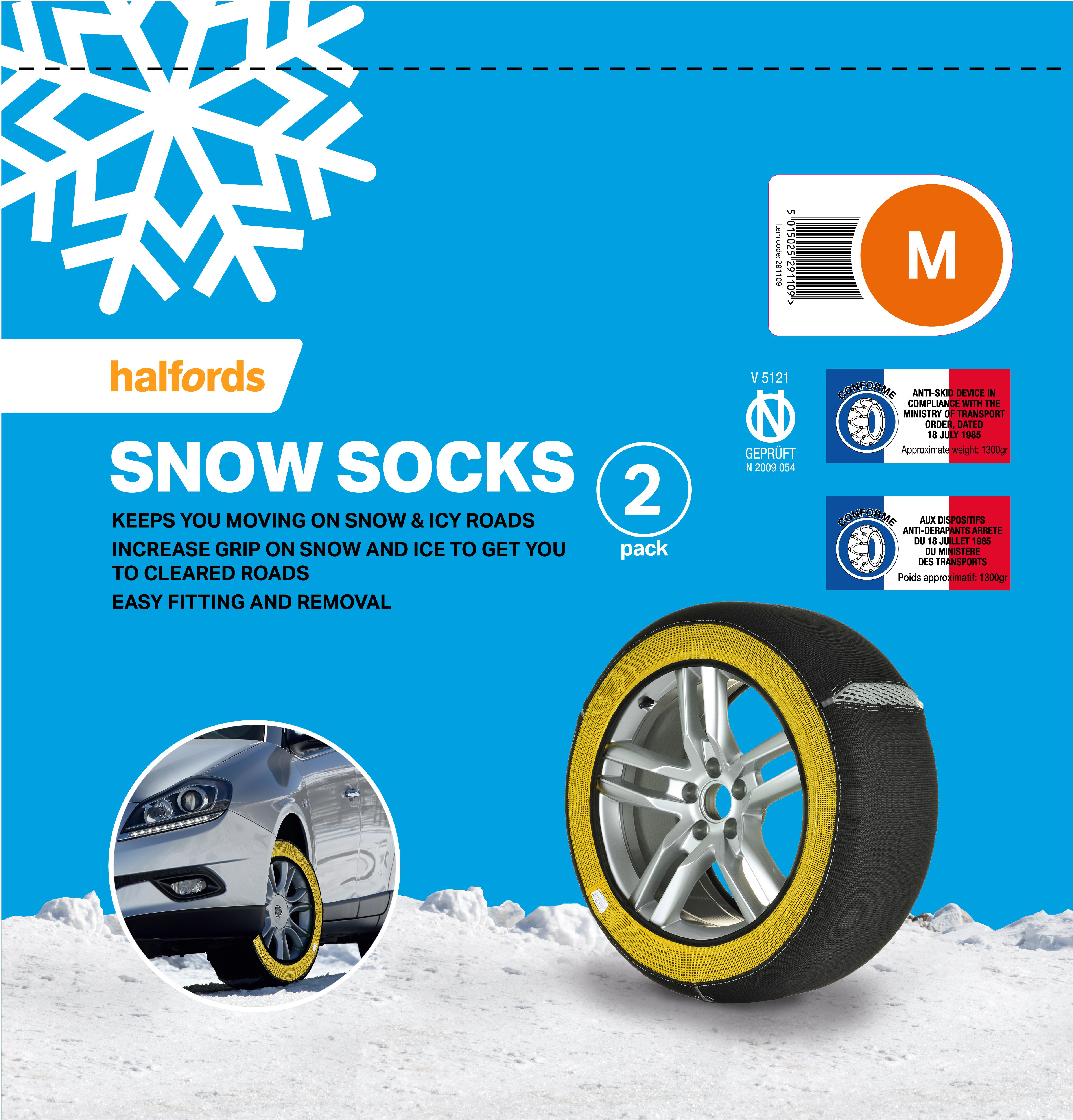 The Halfords Snow Socks Medium are a snow chain alternative that are easy to fit and lightweight, perfect for use in sporadic and sudden snowfall. These snow socks give the grip needed on snow and icy roads to keep you moving. Now approved to be used as a snow chain equivalent in French ski resorts.