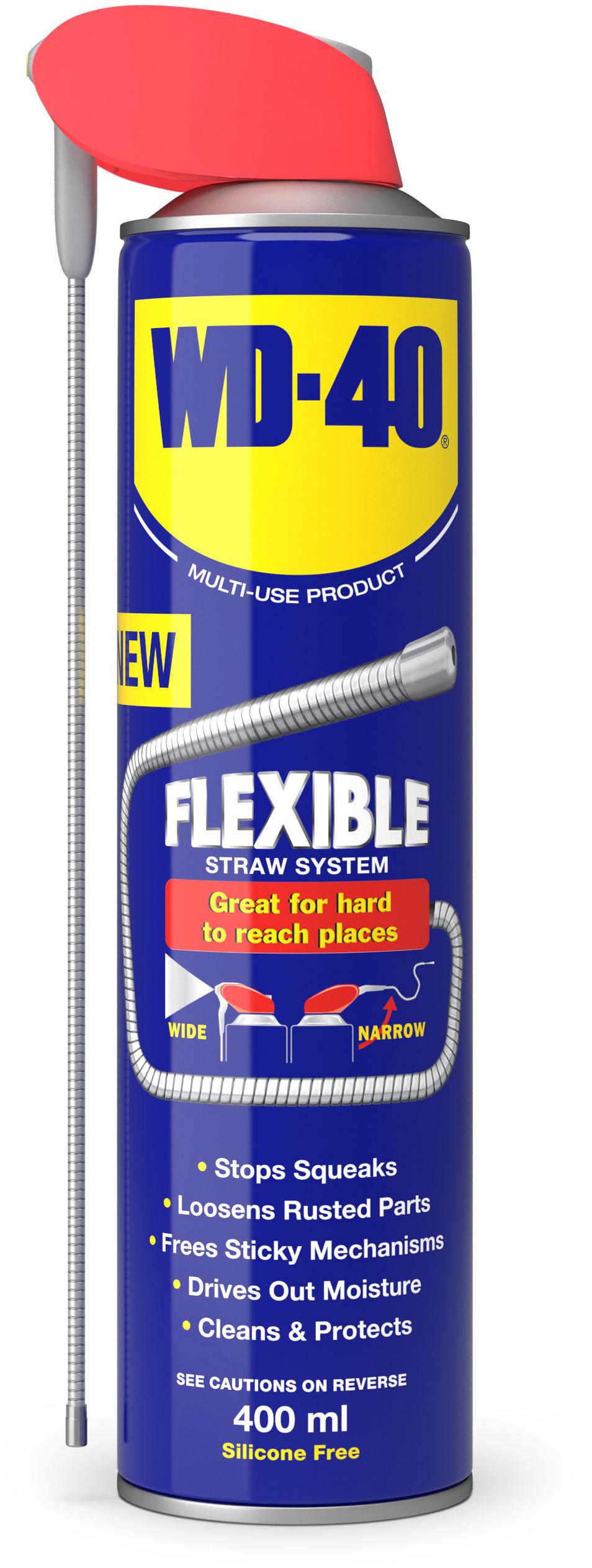 WD-40 Flexible, has a super bendy, flexible metal straw that can be shaped to cope with every angle, corner, unseen target and difficult-to-reach area you can imagine. The metal flexible straw gives you an even more convenient delivery system, holding whatever shape it is bent into to allow application in incredibly tight, intricate spaces such as around pipework and behind panels. With the Sprays2Ways technology, you still have the option to flip down the straw and apply a wide spray to areas needing maximum coverage.