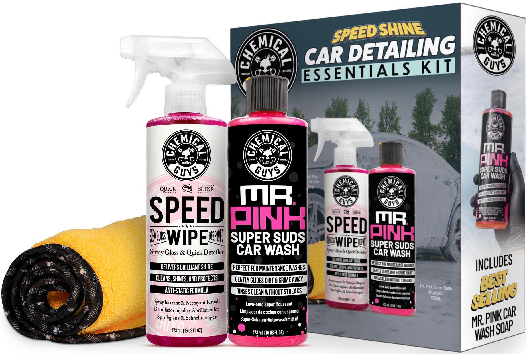 Chemical Guys Speed Shine Car Detailing Essentials Kit is your one-stop solution for a glossy, sparkly car! Generate rich, thick suds with Mr. Pink Car Wash Soap to lift dirt and grime and finish off with Speed Wipe Quick Detailer to enhance your vehicle's shine! Complete your detailing routine with the included Professional Grade Microfiber Towel, ensuring a gentle and streak-free wipe every time. Keep your car looking its absolute best with this must-have detailing kit!
