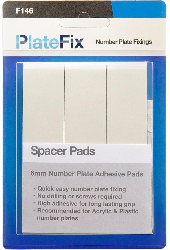 The Number Plate Fixers - 6mm Adhesive Spacer Pads are for direct surface mounting on non-flat surfaces or surfaces with projections over the mounting area. Ensure you clean all wax and dirt from fixing area and reverse of number plate using the cleaning sachet. The spacer pad must be checked to make sure it accommodates the slight curves on some mounting surfaces and projections on others. Apply three pads in position to reverse of the number plate and remove protective film from pads and press firmly into position. Hold for ten seconds to ensure good contact. Full bonding strength is reached after 24 hour and the minimum application temperature is 10c.