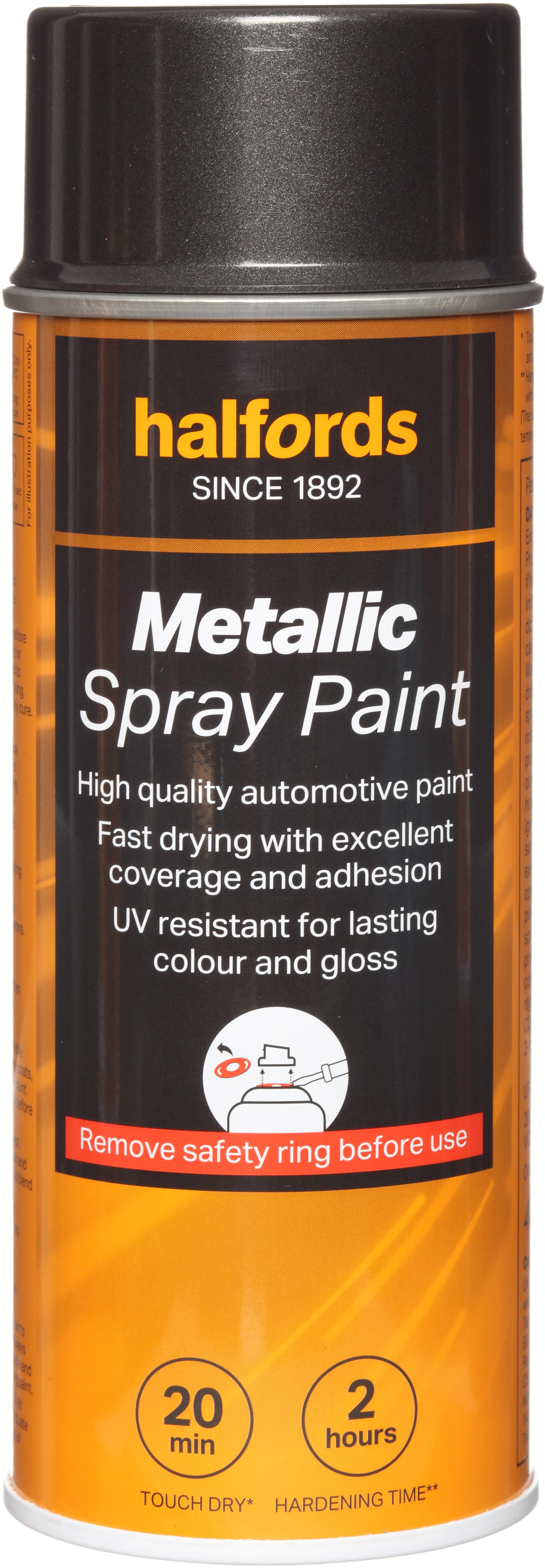 The Halfords Black Metallic Spray Paint is an acrylic-based spray paint, perfect for repairing damage and respraying car panels. It can also be used on aluminium, steel, wood, stone, and most plastics with an appropriate primer.This car spray paint helps you get a professional finish when repairing damage or respraying panels, thanks to the colour match system. We pair your vehicle’s colour code to one of our colour formulas to give you a great match.