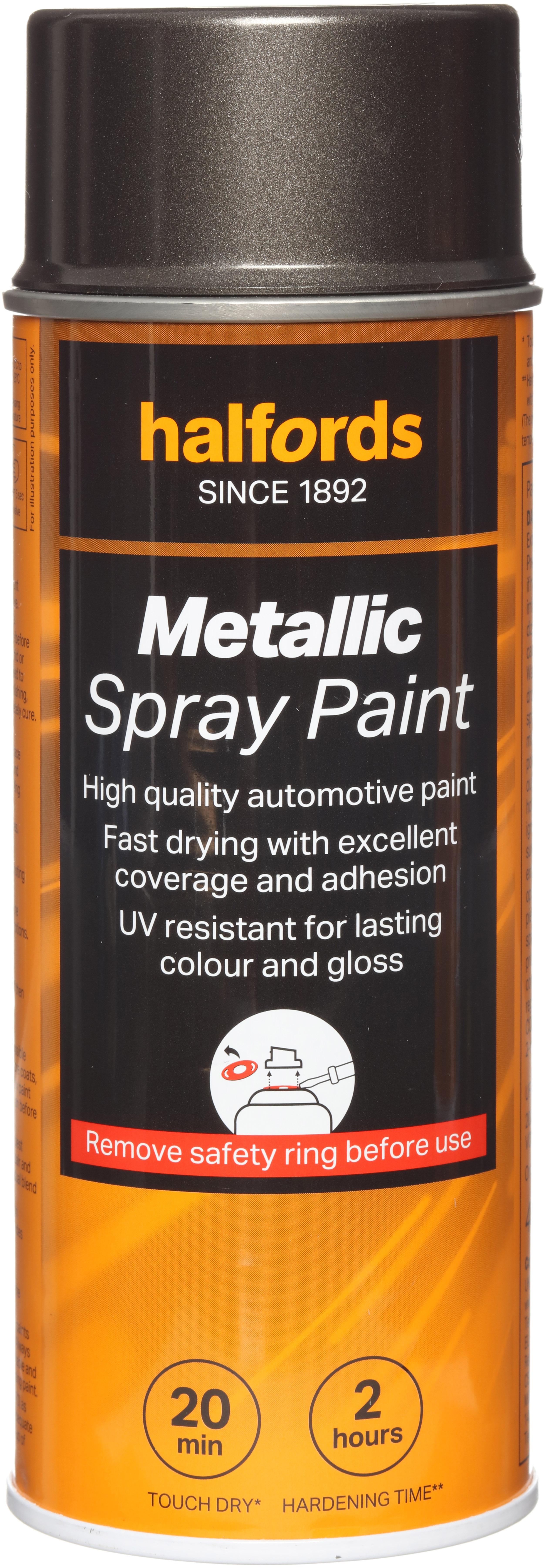 The Halfords Grey Metallic Spray Paint is an automotive-grade spray paint. It’s acrylic-based, and can be used on almost all vehicle finishes as well as steel, aluminium, most plastics, wood & stone.Repair damage and bring faded panels back to life with this car spray paint. It has excellent coverage and filling properties to give you a smooth finish, and adheres flawlessly with the right primer.