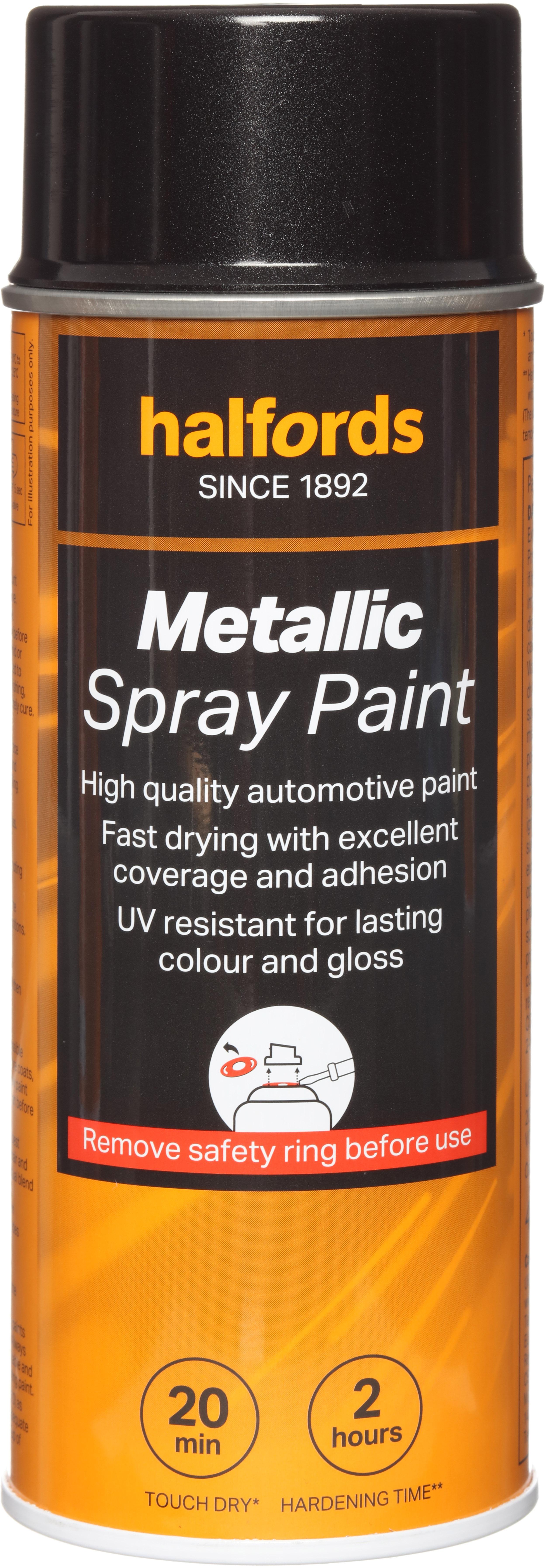 The Halfords Black Metallic Spray Paint is an acrylic-based spray paint, perfect for repairing damage and respraying car panels. It can also be used on aluminium, steel, wood, stone, and most plastics with an appropriate primer.This car spray paint helps you get a professional finish when repairing damage or respraying panels, thanks to the colour match system. We pair your vehicle’s colour code to one of our colour formulas to give you a great match.
