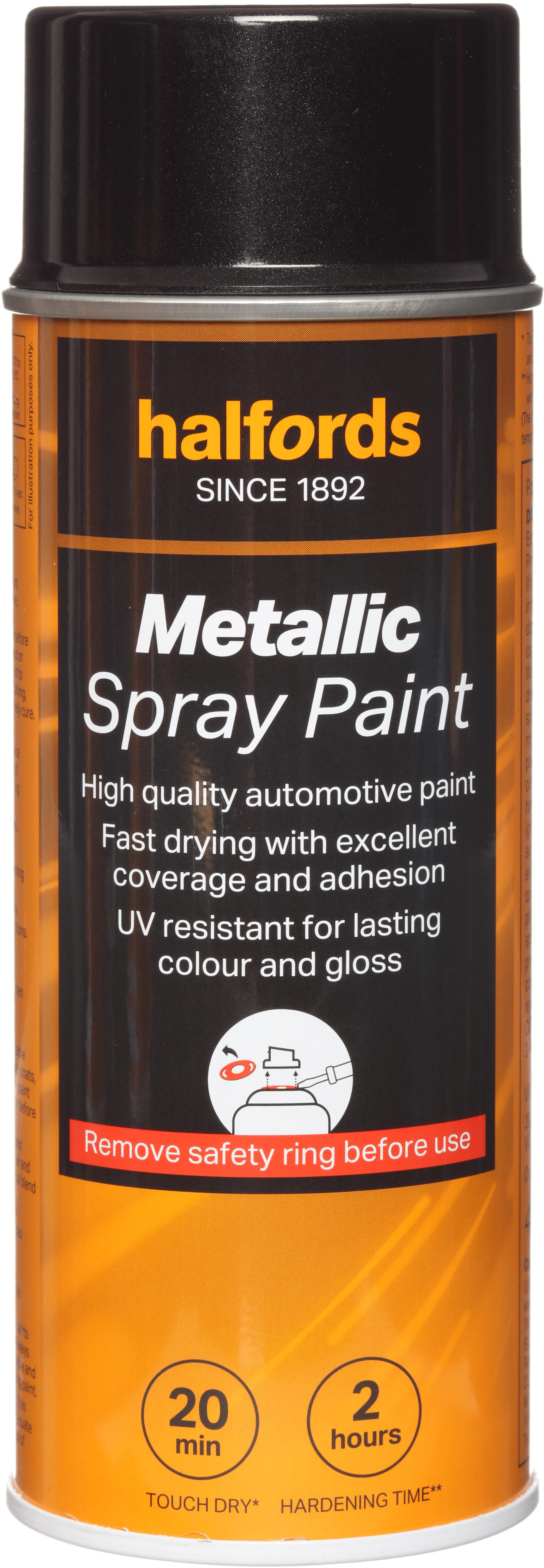 The Halfords Black Metallic Spray Paint is an acrylic-based spray paint, perfect for repairing damage and respraying car panels. It can also be used on aluminium, steel, wood, stone, and most plastics with an appropriate primer.This car spray paint helps you get a professional finish when repairing damage or respraying panels, thanks to the colour match system. We pair your vehicle’s colour code to one of our colour formulas to give you a great match.