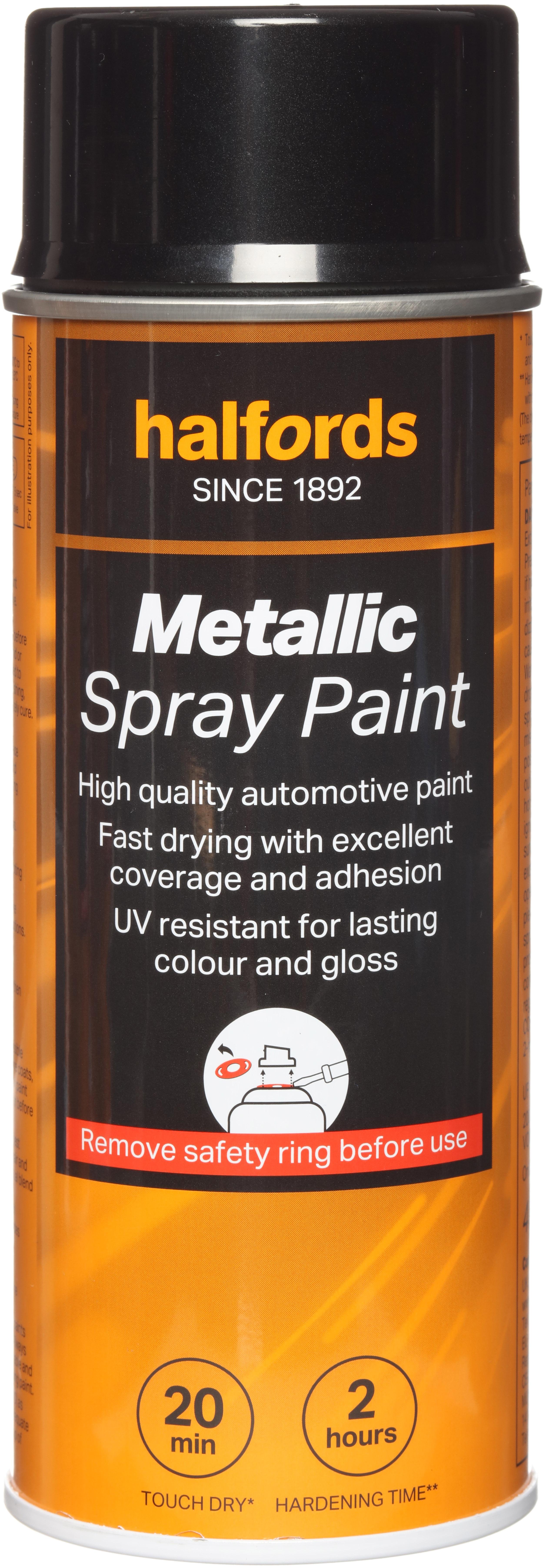 The Halfords Black Metallic Spray Paint is an acrylic-based spray paint, perfect for repairing damage and respraying car panels. It can also be used on aluminium, steel, wood, stone, and most plastics with an appropriate primer.This car spray paint helps you get a professional finish when repairing damage or respraying panels, thanks to the colour match system. We pair your vehicle’s colour code to one of our colour formulas to give you a great match.