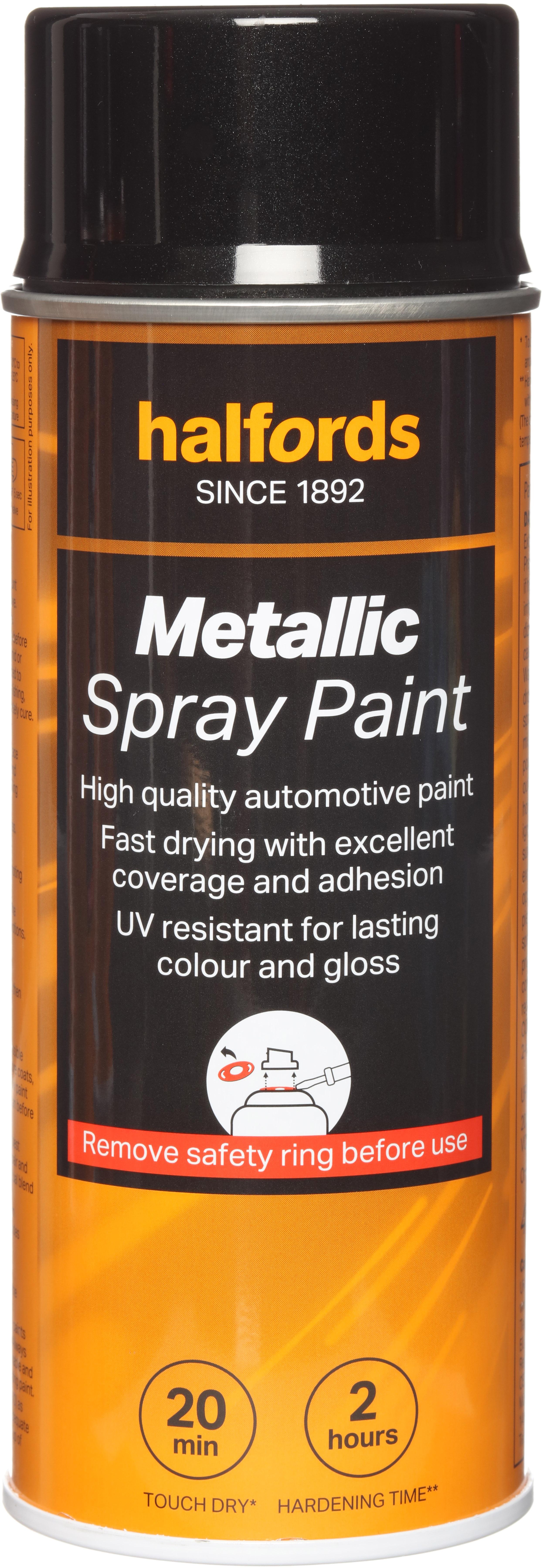 The Halfords Black Metallic Spray Paint is an acrylic-based spray paint, perfect for repairing damage and respraying car panels. It can also be used on aluminium, steel, wood, stone, and most plastics with an appropriate primer.