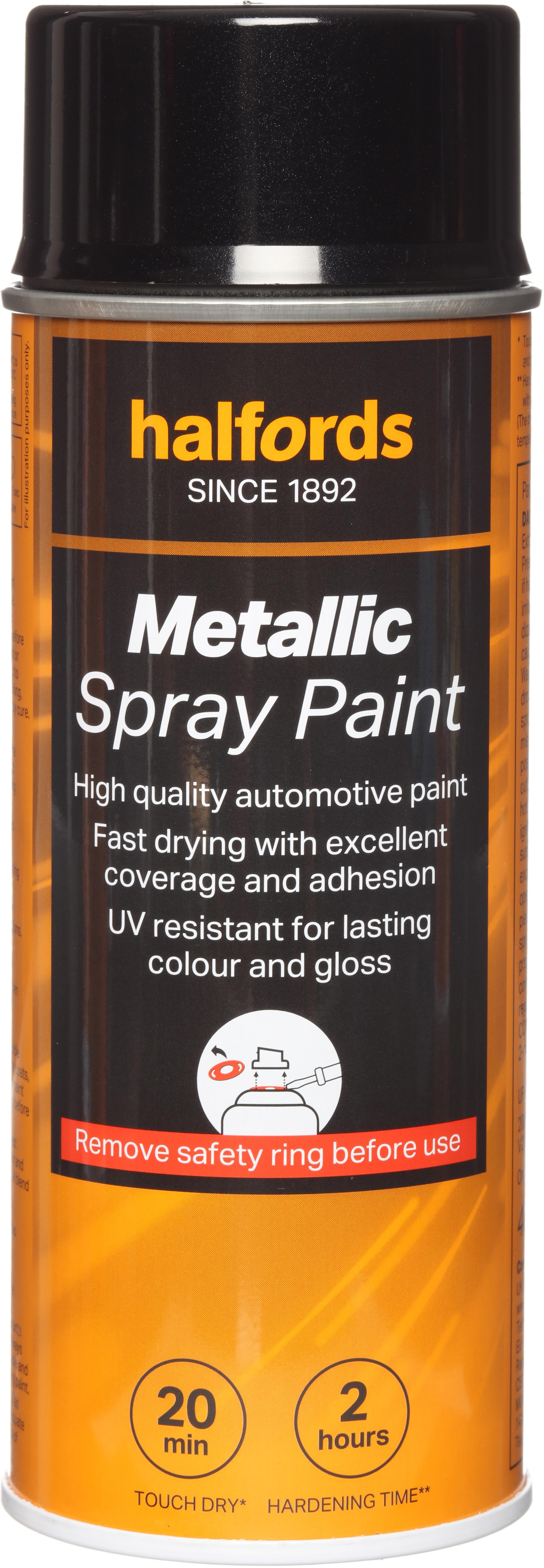 The Halfords Black Metallic Spray Paint is an acrylic-based spray paint, perfect for repairing damage and respraying car panels. It can also be used on aluminium, steel, wood, stone, and most plastics with an appropriate primer.This car spray paint helps you get a professional finish when repairing damage or respraying panels, thanks to the colour match system. We pair your vehicle’s colour code to one of our colour formulas to give you a great match.
