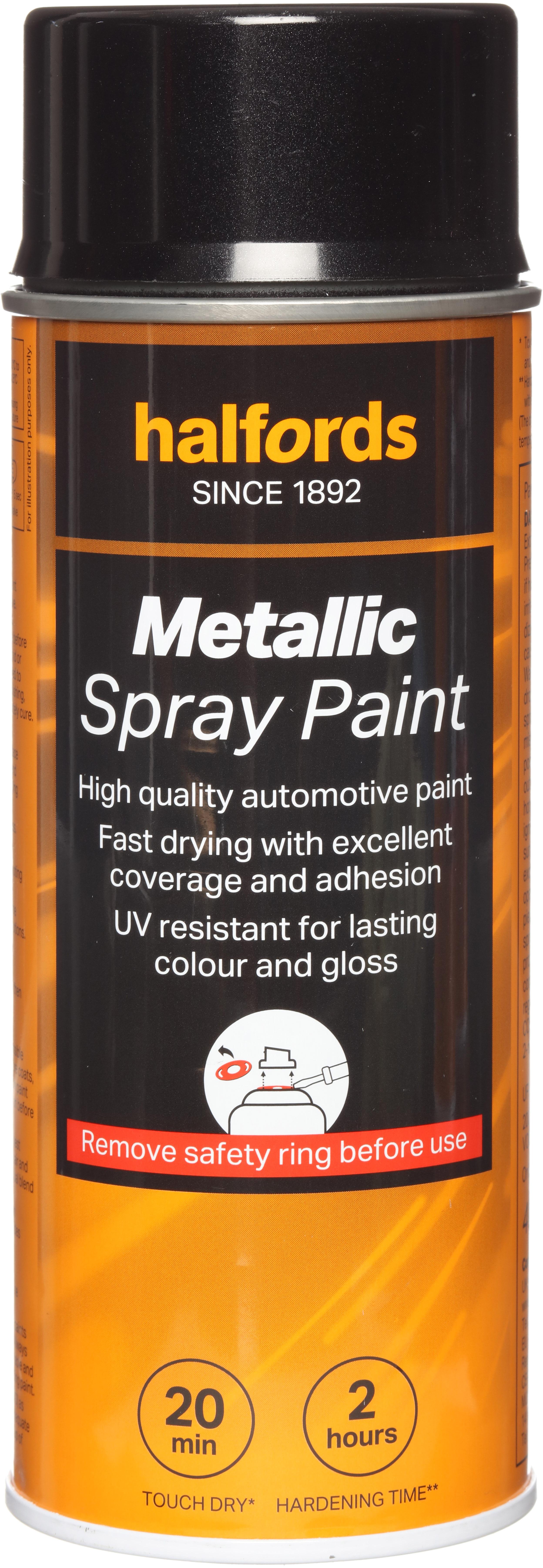 The Halfords Black Metallic Spray Paint is an acrylic-based spray paint, perfect for repairing damage and respraying car panels. It can also be used on aluminium, steel, wood, stone, and most plastics with an appropriate primer.This car spray paint helps you get a professional finish when repairing damage or respraying panels, thanks to the colour match system. We pair your vehicle’s colour code to one of our colour formulas to give you a great match.