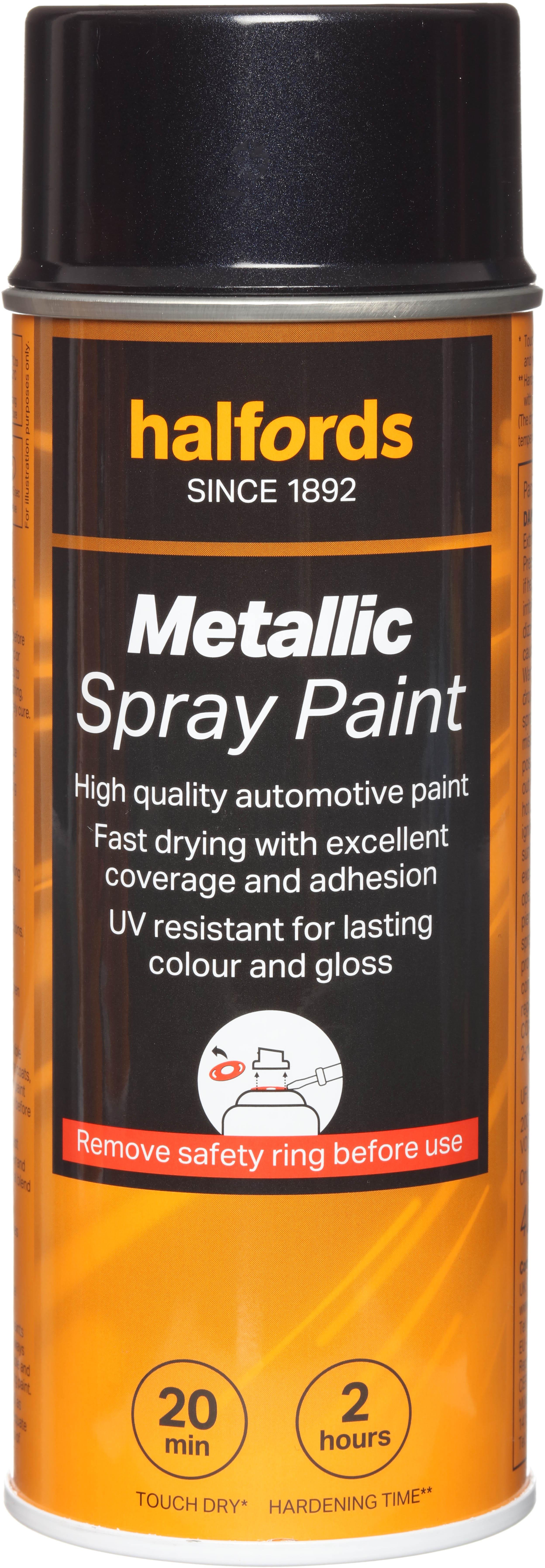 The Halfords Black Metallic Spray Paint is an acrylic-based spray paint, perfect for repairing damage and respraying car panels. It can also be used on aluminium, steel, wood, stone, and most plastics with an appropriate primer.This car spray paint helps you get a professional finish when repairing damage or respraying panels, thanks to the colour match system. We pair your vehicle’s colour code to one of our colour formulas to give you a great match.
