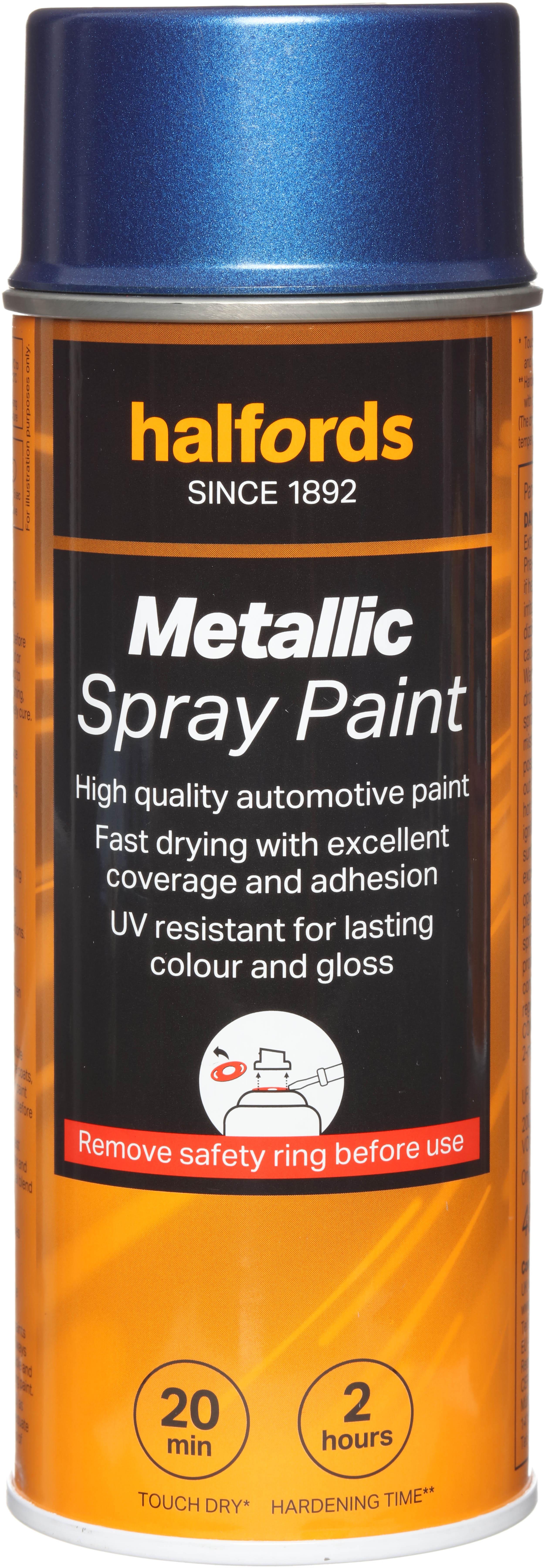 The Halfords Blue Metallic Spray Paint is an automotive-grade spray paint. It’s acrylic-based, and can be used on almost all vehicle finishes as well as steel, aluminium, most plastics, wood & stone.