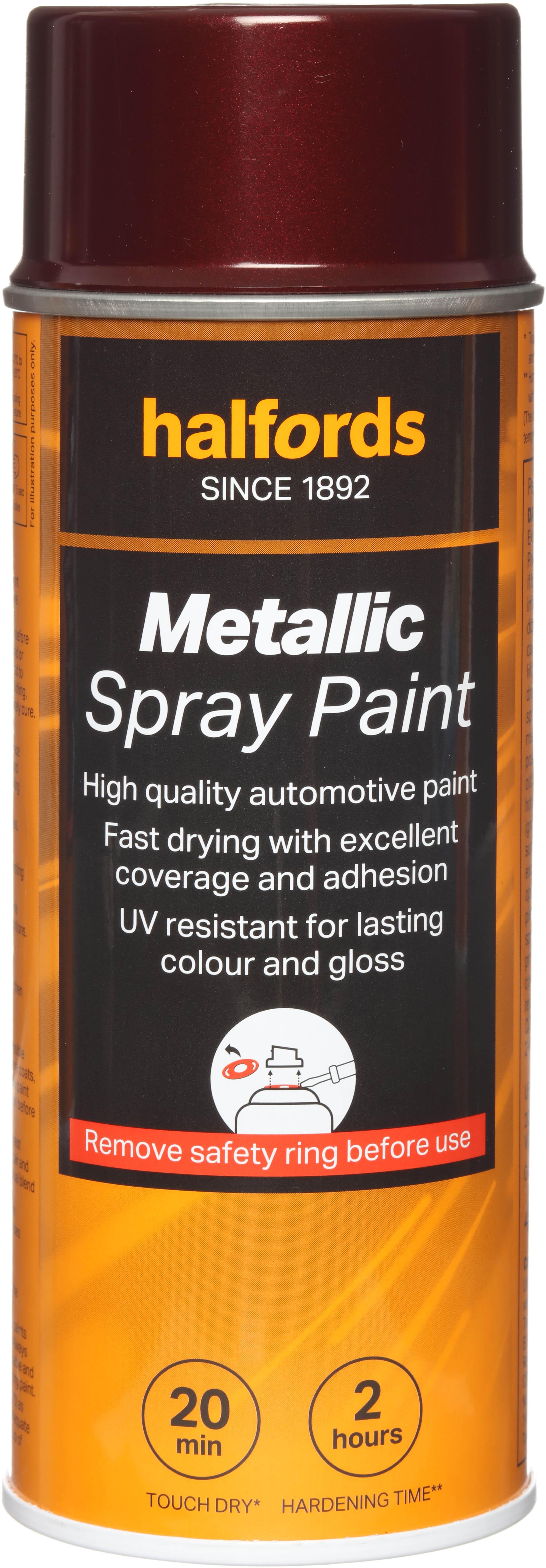 The Halfords Red Metallic Spray Paint is an acrylic-based spray paint, perfect for repairing damage and respraying car panels. It can also be used on aluminium, steel, wood, stone, and most plastics with an appropriate primer.Repair damage and bring faded panels back to life with this car spray paint. It has excellent coverage and filling properties to give you a smooth finish, and adheres flawlessly with the right primer.