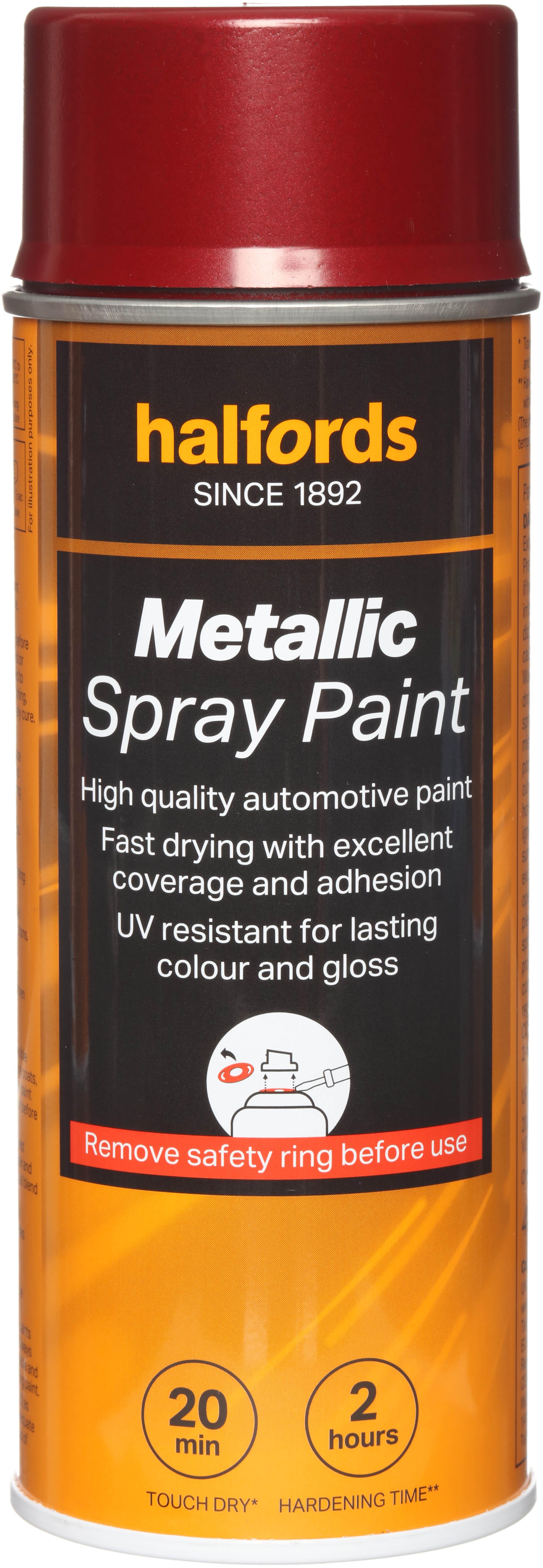 The Halfords Red Metallic Spray Paint is an acrylic-based spray paint, perfect for repairing damage and respraying car panels. It can also be used on aluminium, steel, wood, stone, and most plastics with an appropriate primer.Repair damage and bring faded panels back to life with this car spray paint. It has excellent coverage and filling properties to give you a smooth finish, and adheres flawlessly with the right primer.