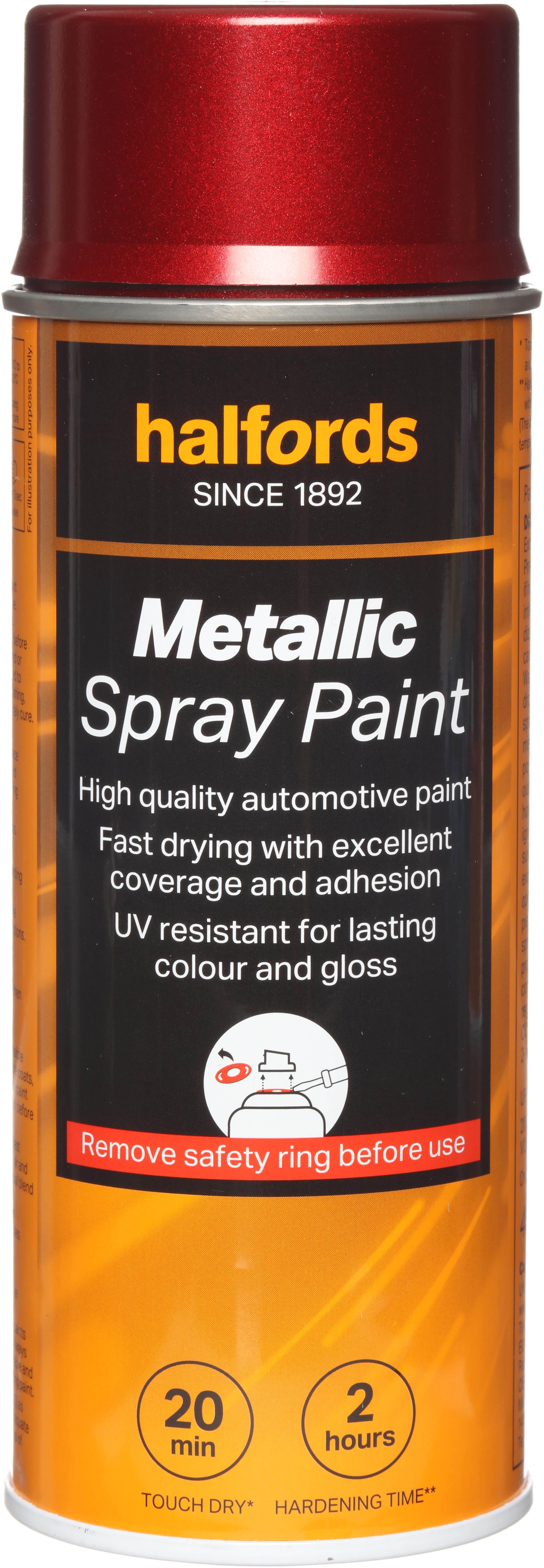 The Halfords Red Metallic Spray Paint is an acrylic-based spray paint, perfect for repairing damage and respraying car panels. It can also be used on aluminium, steel, wood, stone, and most plastics with an appropriate primer.Repair damage and bring faded panels back to life with this car spray paint. It has excellent coverage and filling properties to give you a smooth finish, and adheres flawlessly with the right primer.