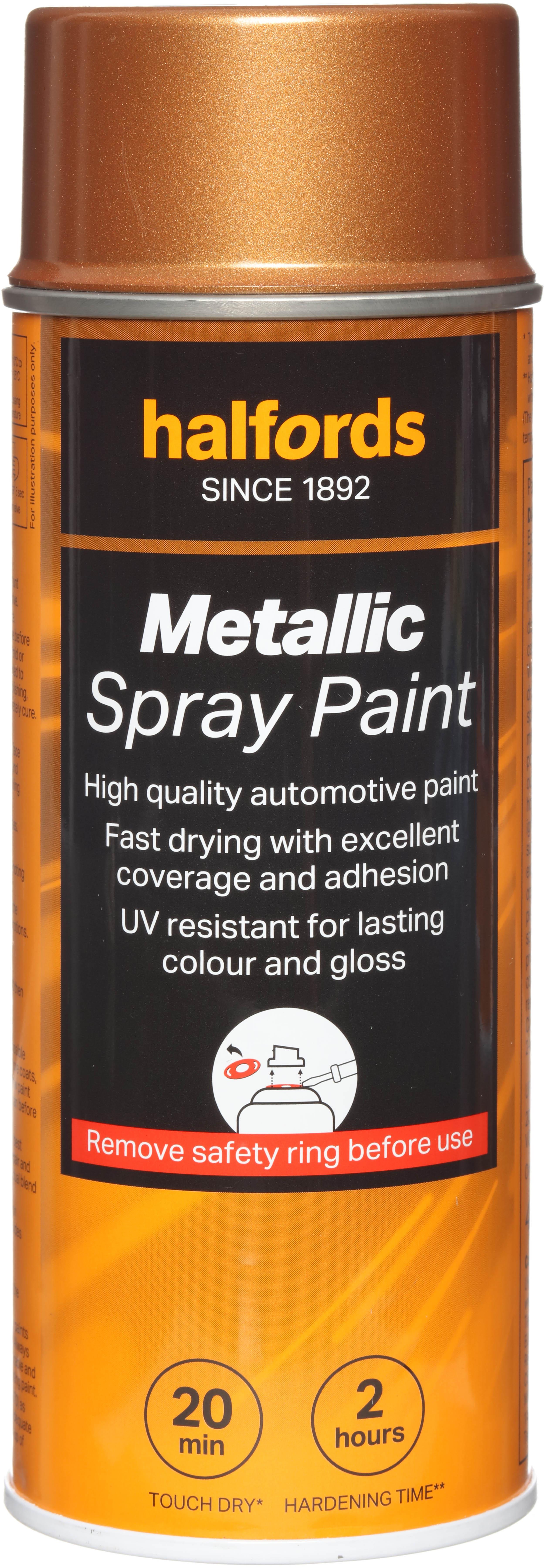 The Halfords Copper Metallic Spray Paint is an automotive-grade spray paint. It’s acrylic-based, and can be used on almost all vehicle finishes as well as steel, aluminium, most plastics, wood & stone.Finding the right colour on your own can be tough, which is why we use a colour match system. We match your car’s colour code to the right can, so you get a professional finish.