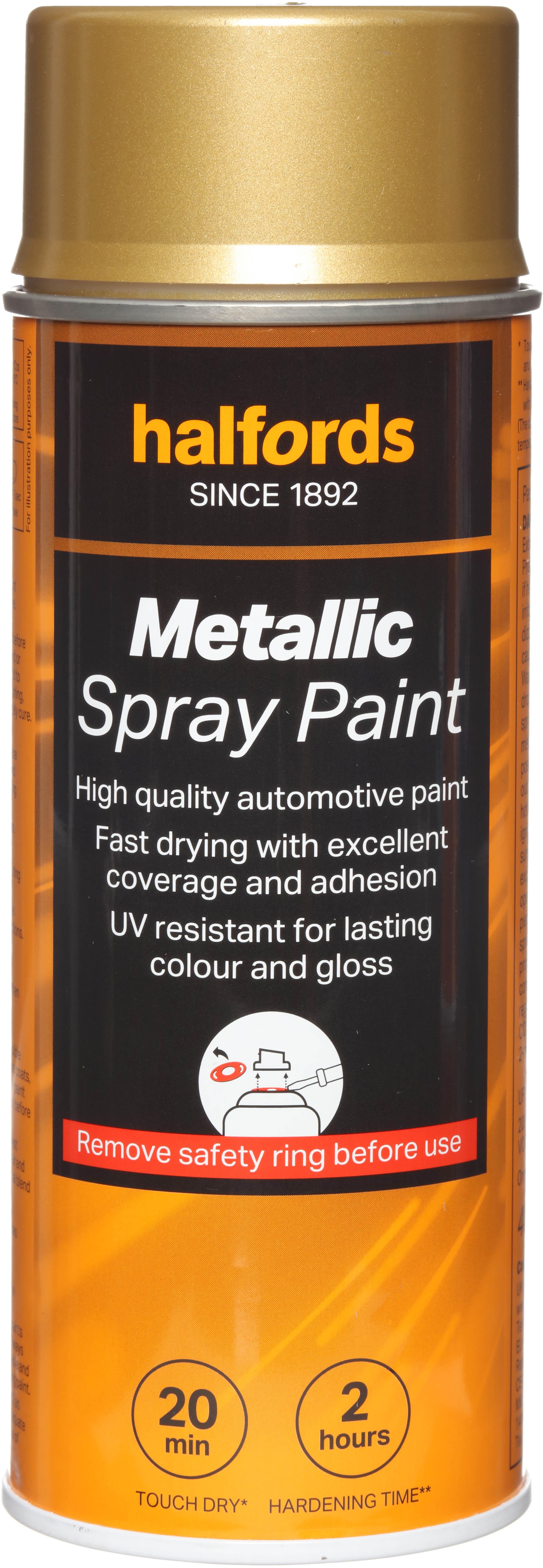 The Halfords Gold Metallic Spray Paint is an automotive-grade spray paint. It’s acrylic-based, and can be used on almost all vehicle finishes as well as steel, aluminium, most plastics, wood & stone.This car spray paint helps you get a professional finish when repairing damage or respraying panels, thanks to the colour match system. We pair your vehicle’s colour code to one of our colour formulas to give you a great match.