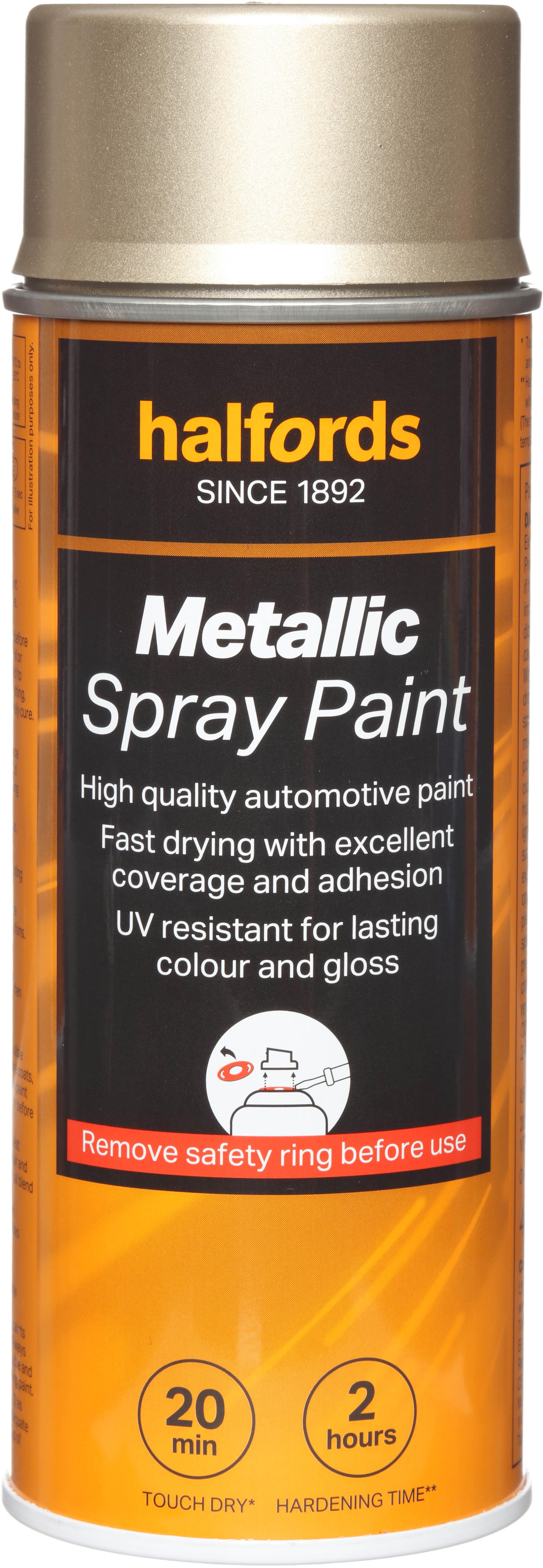 The Halfords Gold Metallic Spray Paint is an automotive-grade spray paint. It’s acrylic-based, and can be used on almost all vehicle finishes as well as steel, aluminium, most plastics, wood & stone.This car spray paint helps you get a professional finish when repairing damage or respraying panels, thanks to the colour match system. We pair your vehicle’s colour code to one of our colour formulas to give you a great match.
