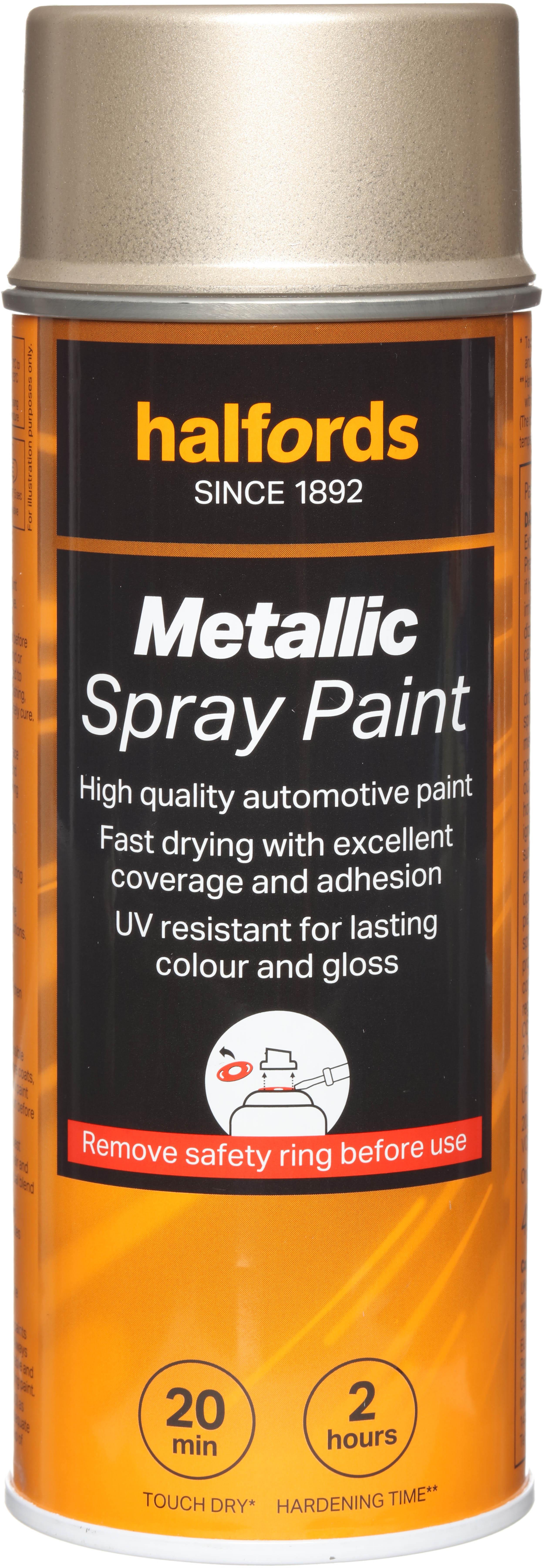 The Halfords Gold Metallic Spray Paint is an automotive-grade spray paint. It’s acrylic-based, and can be used on almost all vehicle finishes as well as steel, aluminium, most plastics, wood & stone.This car spray paint helps you get a professional finish when repairing damage or respraying panels, thanks to the colour match system. We pair your vehicle’s colour code to one of our colour formulas to give you a great match.
