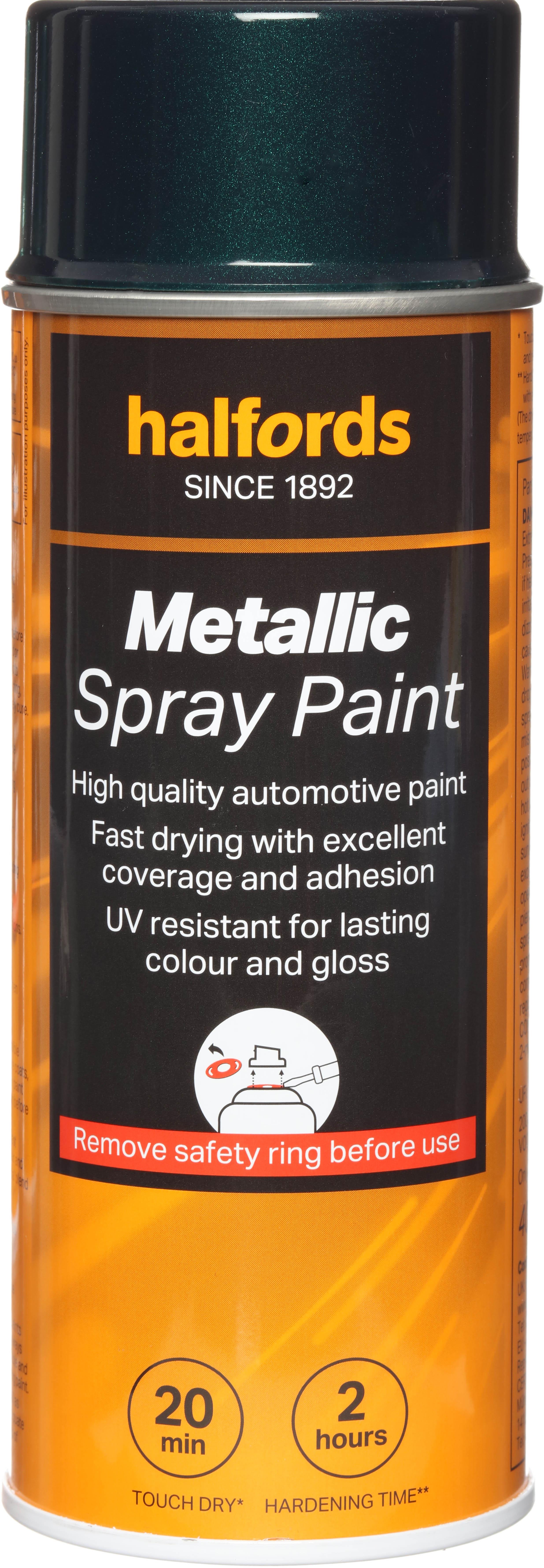 The Halfords Green Metallic Spray Paint is an automotive-grade spray paint. It’s acrylic-based, and can be used on almost all vehicle finishes as well as steel, aluminium, most plastics, wood & stone.This car spray paint helps you get a professional finish when repairing damage or respraying panels, thanks to the colour match system. We pair your vehicle’s colour code to one of our colour formulas to give you a great match.