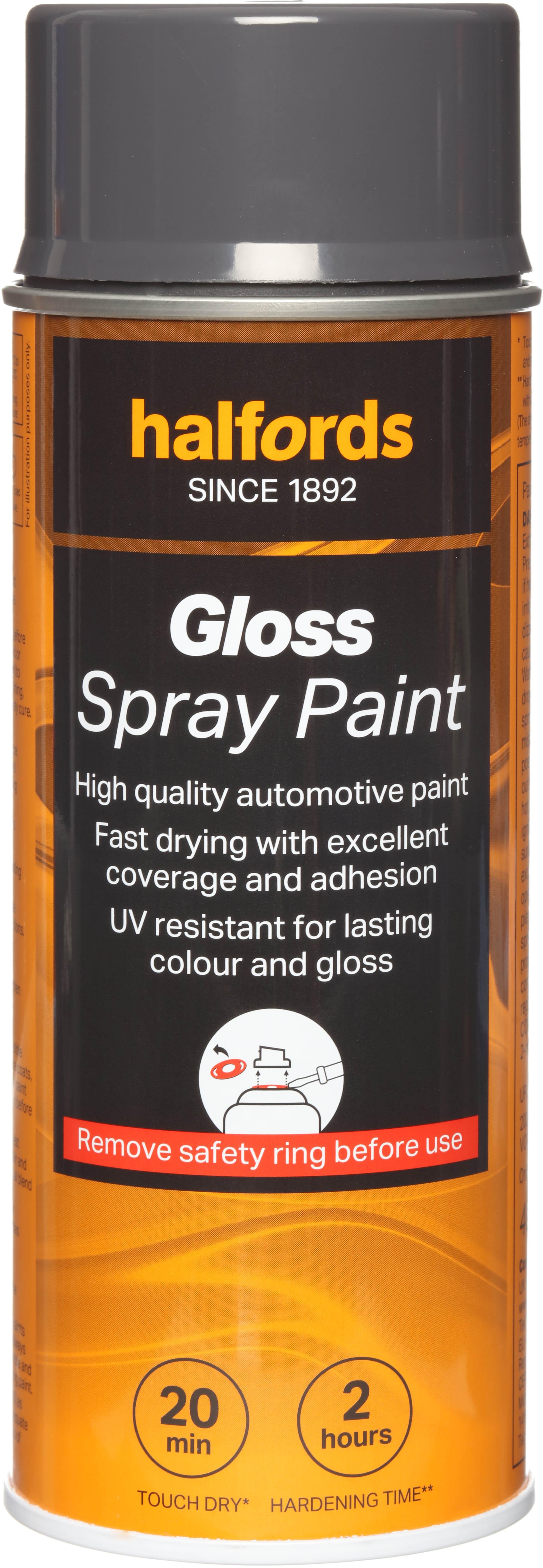 The Halfords Grey Gloss Spray Paint is an acrylic-based spray paint, perfect for repairing damage and respraying car panels. It can also be used on aluminium, steel, wood, stone, and most plastics with an appropriate primer.This high-quality paint is fast-drying to make the job as easy and mess-free as possible, giving you excellent coverage and adhesion when used with a primer.