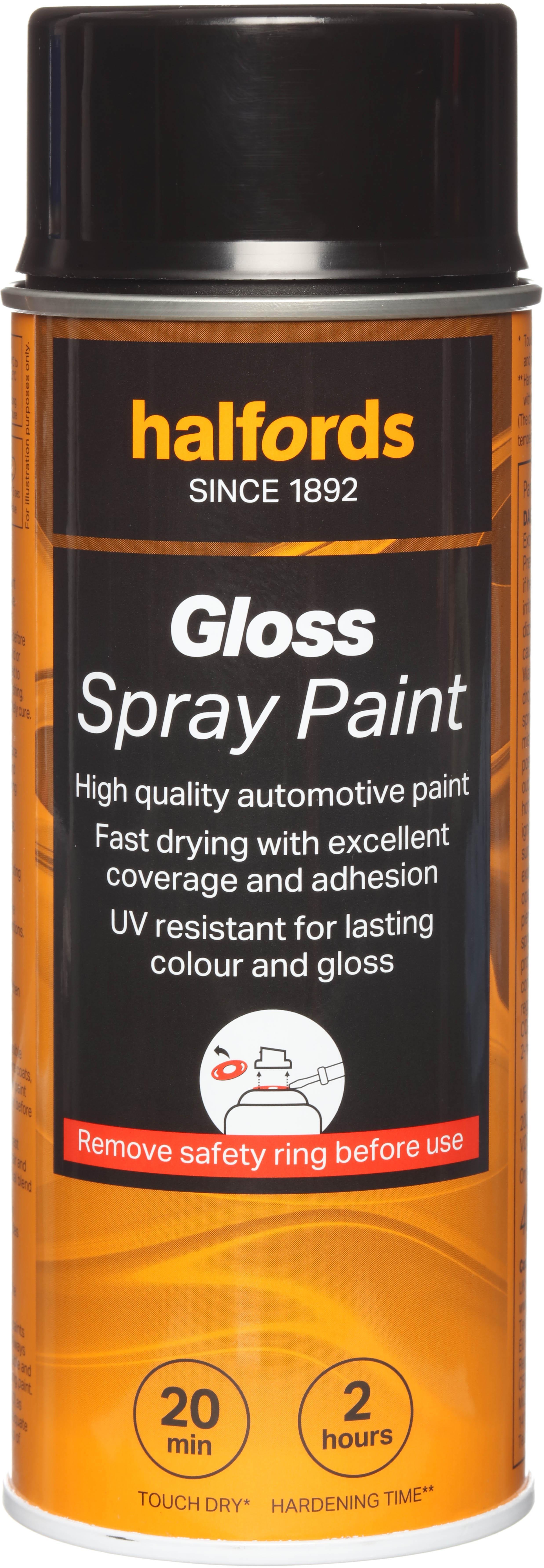 The Halfords Black Gloss Spray Paint is an automotive-grade spray paint. It’s acrylic-based, and can be used on almost all vehicle finishes as well as steel, aluminium, most plastics, wood & stone.This high-quality paint is fast-drying to make the job as easy and mess-free as possible, giving you excellent coverage and adhesion when used with a primer.