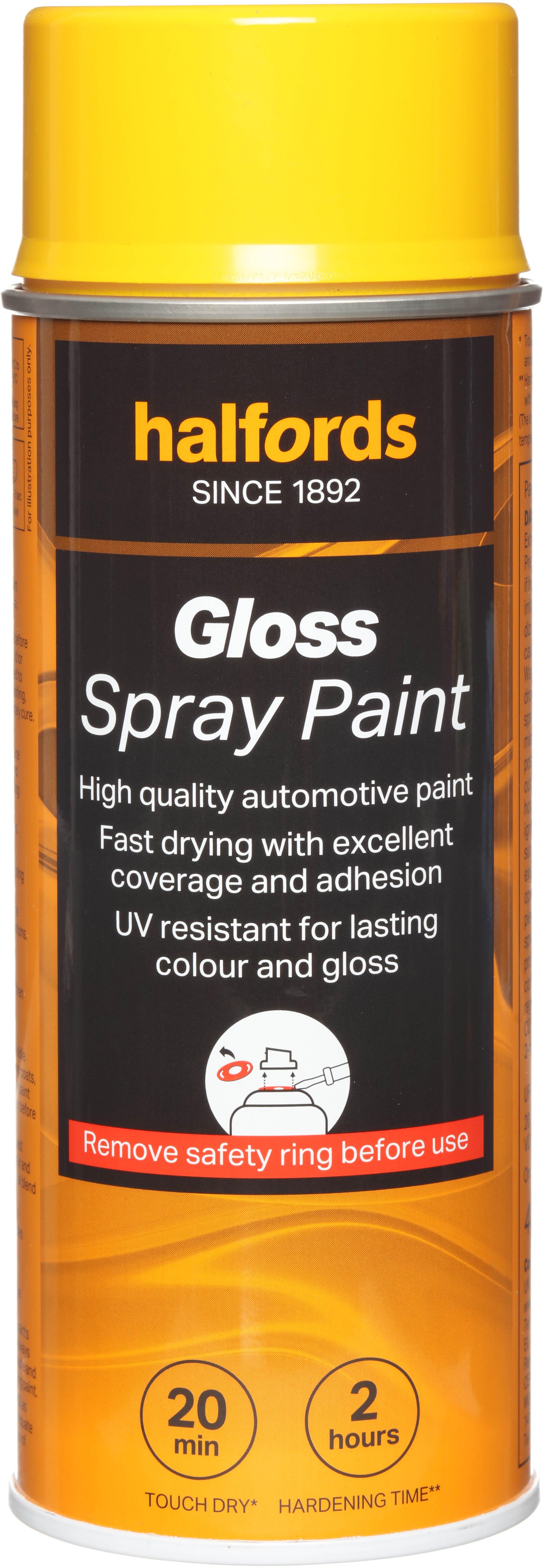 The Halfords Yellow Gloss Spray Paint is an automotive-grade spray paint. It’s acrylic-based, and can be used on almost all vehicle finishes as well as steel, aluminium, most plastics, wood & stone.This high-quality paint is fast-drying to make the job as easy and mess-free as possible, giving you excellent coverage and adhesion when used with a primer.