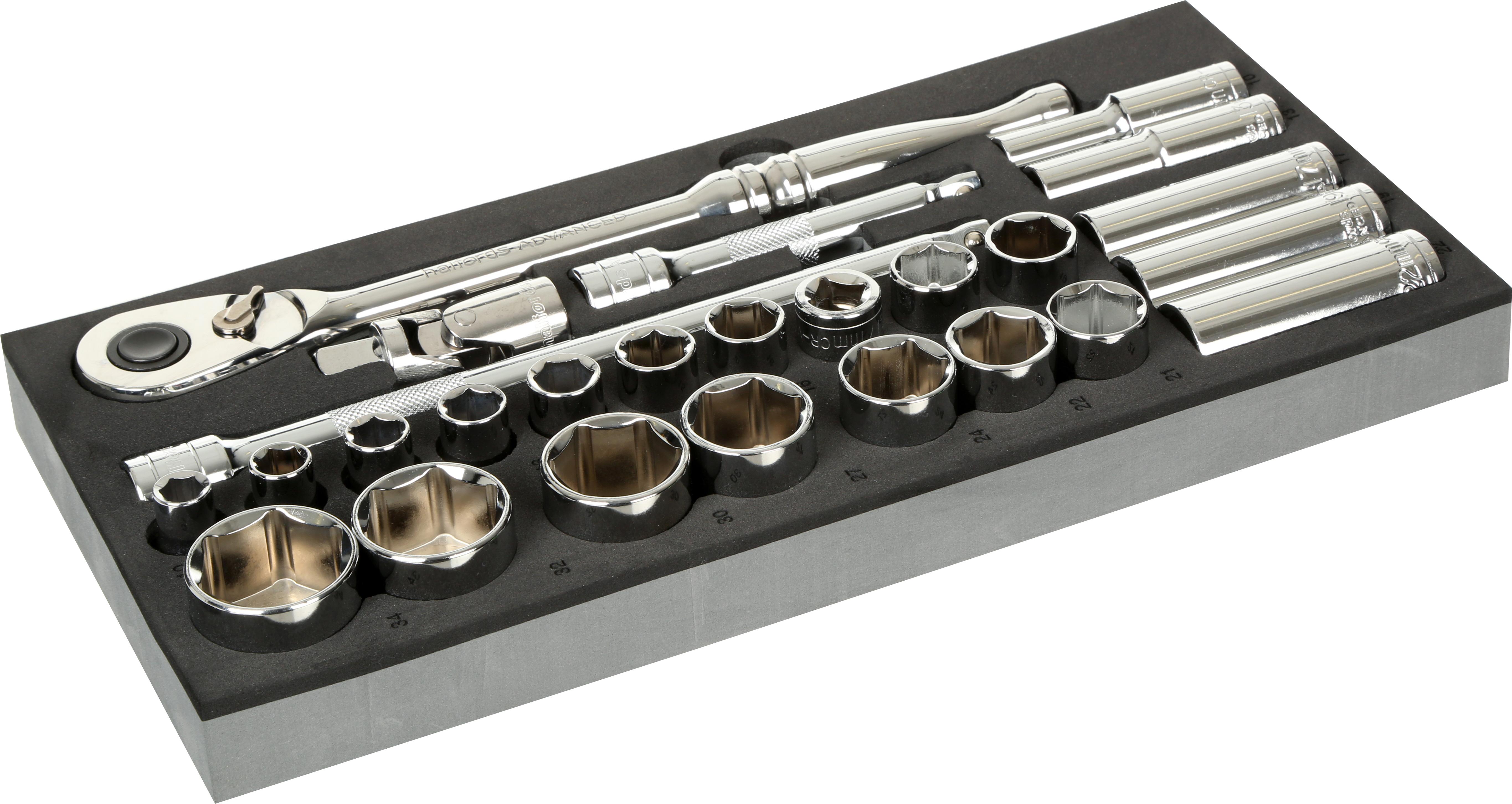 The Halfords Advanced 26 Piece 1/2" Socket Set Modular Tray provides a lower swing arc, which means you need just 3.6 degrees of movement before the next tooth is engaged. Combined with the low-profile head design, this makes it the perfect choice for working in confined spaces. The longer handle gives you better access and increased leverage, and the quick release button allows sockets to be easily detached.