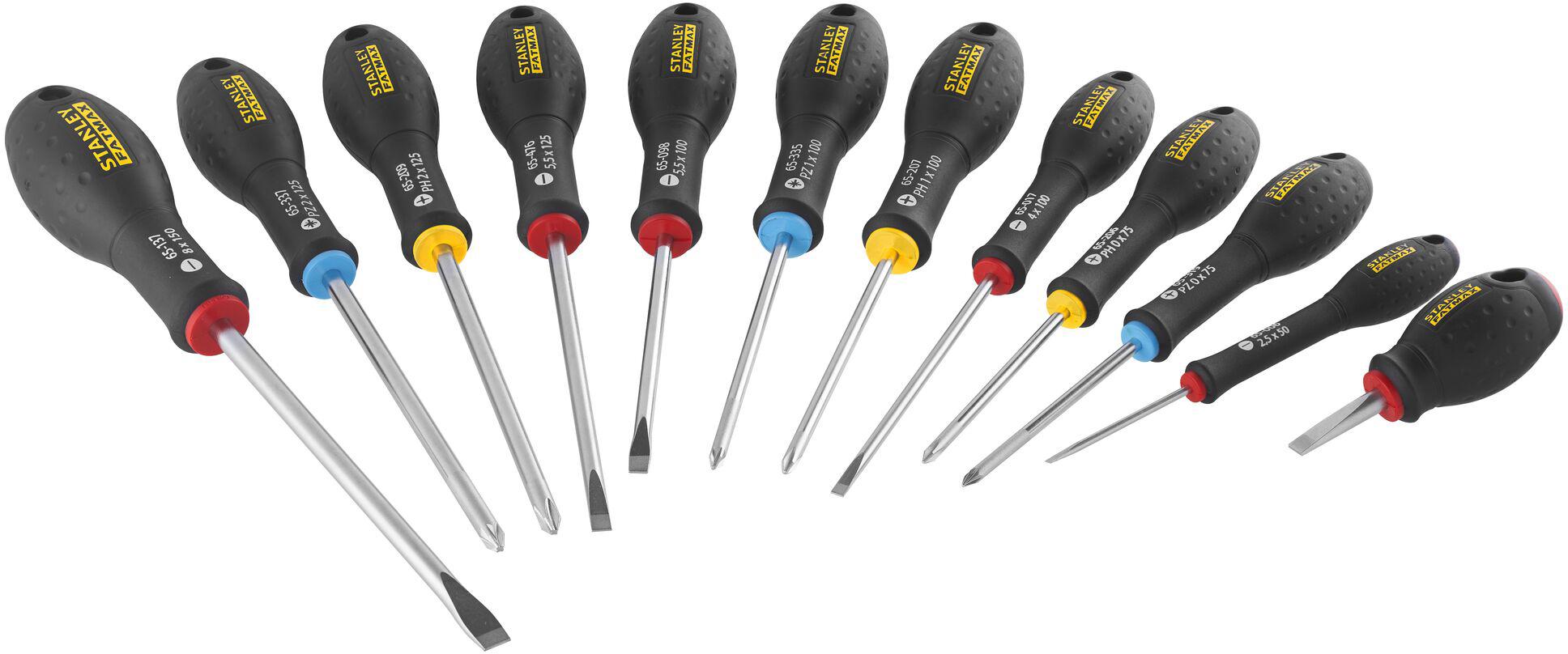 The Stanley FatMax 12 Piece Screwdriver Set has large soft-grip, tri-material ergonomic handle designed to reduce of fatigue and increase comfort in repetitive applications.  Narrow waist and smooth, domed end deliver excellent torque, speed, control and ease-of-use in challenging fastening or loosening applications, ideal for driving wood screws.