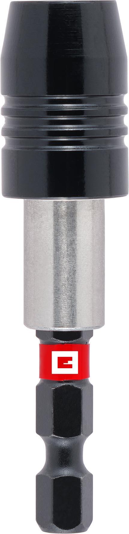 The Einhell Impact quick-change bit holder has been developed for demanding screwdriving work. With a length of 65 mm and a 1/4 inch E 6.3 shank made of robust and impact-resistant chrome vanadium, the colour ring of which features an Einhell logo, it offers high wear resistance. The torsion zone of the bit holder is able to cope effectively with torque peaks as it absorbs forces and vibrations during the screwdriving process. This reduces the load on the bit. The quick-change bit holder is equipped with a stainless steel sleeve containing a strong permanent magnet. This transfers the magnetism precisely via the bit to the screw, ensuring a secure hold and precise guidance. The quick-change mechanism enables the bit to be released by simply pulling back the aluminium sleeve. In this way, the bits can be changed quickly and easily with one hand. The bit is then automatically fixed in the holder with the spring washer. Thanks to its universal fit, the impact bit holder is compatible with all commercially available impact screwdrivers, cordless screwdrivers and drills. This makes it ideal for a wide range of applications, whether in the workshop or for DIY projects.