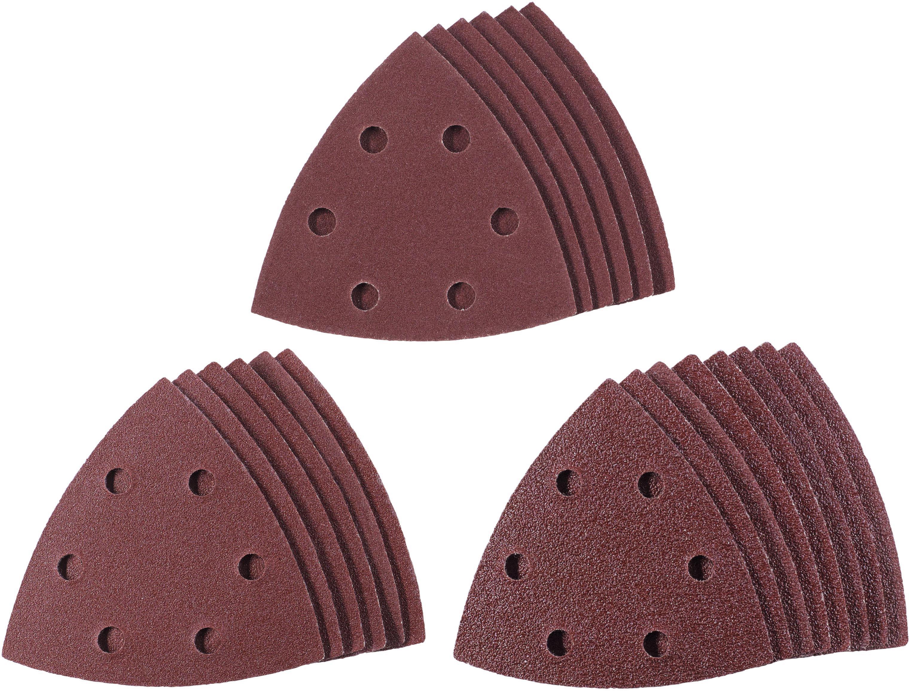 With the original Einhell 20-piece delta sandpaper set, corners or small surfaces made of wood or metal can be processed quickly, precisely and cleanly. Thanks to the perforation, the triangles are suitable for use with a suction device. The strong Velcro fastening makes tool-free changes easy. Thanks to the different granulations, the right abrasive is available for every project. The sanding triangles are suitable for all commercially available delta sanders, especially for the Einhell delta sander TC-DS 19 and TC-DS 20 E. All sanding triangles in the set measure 93 x 93 x 93 mm. The set contains 20 triangles with three different grains, 8x P60, 6x P120 and 6x P180.