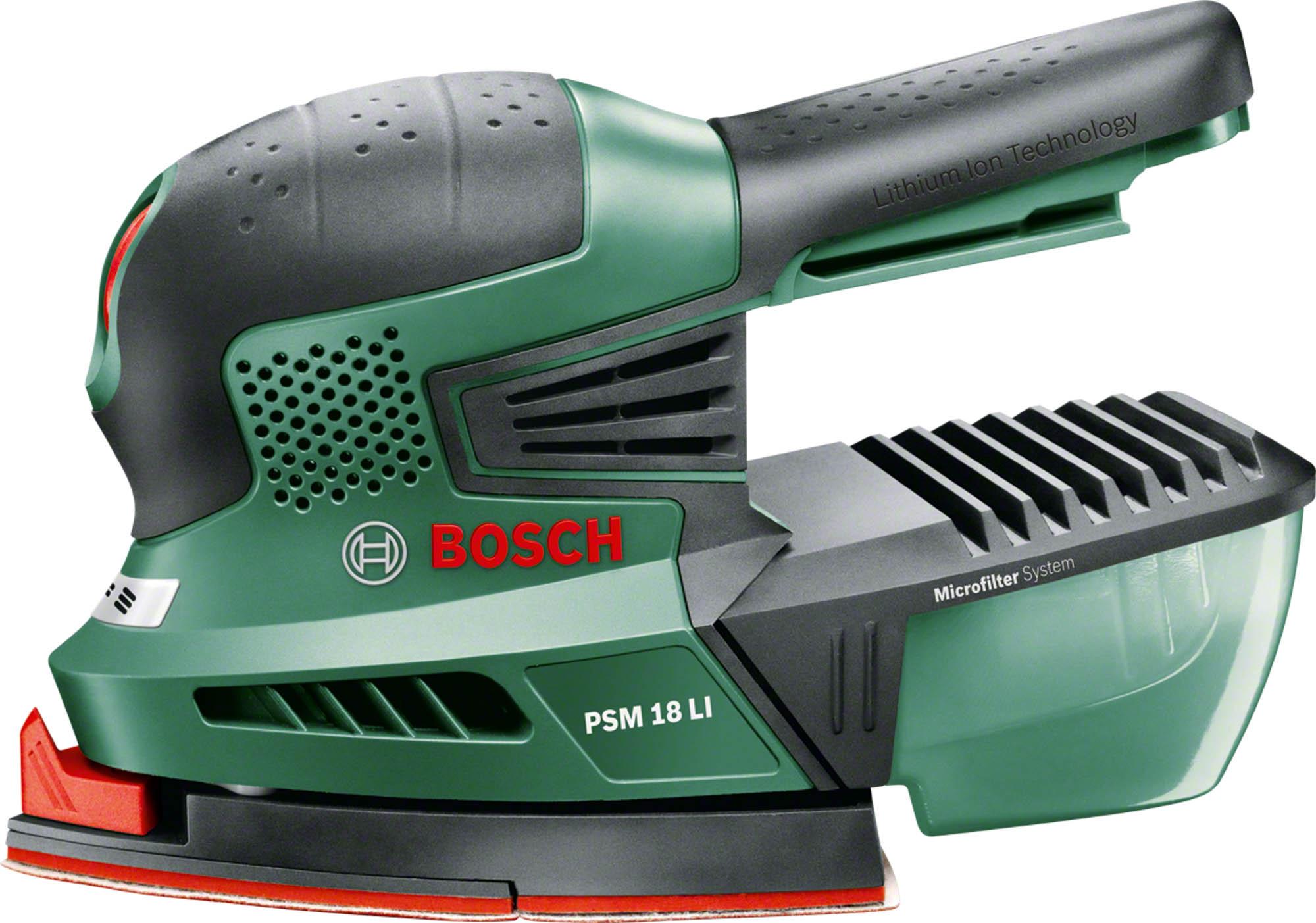 This versatile and powerful, cordless multi-talented tool is perfect for a range of projects. The Bosch PSM 18 LI is designed for work in corners, on edges, and on medium-sized flat surfaces. Enjoy quick sanding attachment changes thanks to the SDS system. The triangular tip is rotatable to ensure optimal sanding paper use. Sanding paper changes are quick and easy due to the hook-and-loop fastening system. This multi-sander is for use on hardwood, softwood, varnished and painted surfaces, metal, and stone to complete projects on furniture, doors, frames, and stairs.- Powerful all-rounder for corners, edges, and medium-sized flat surfaces