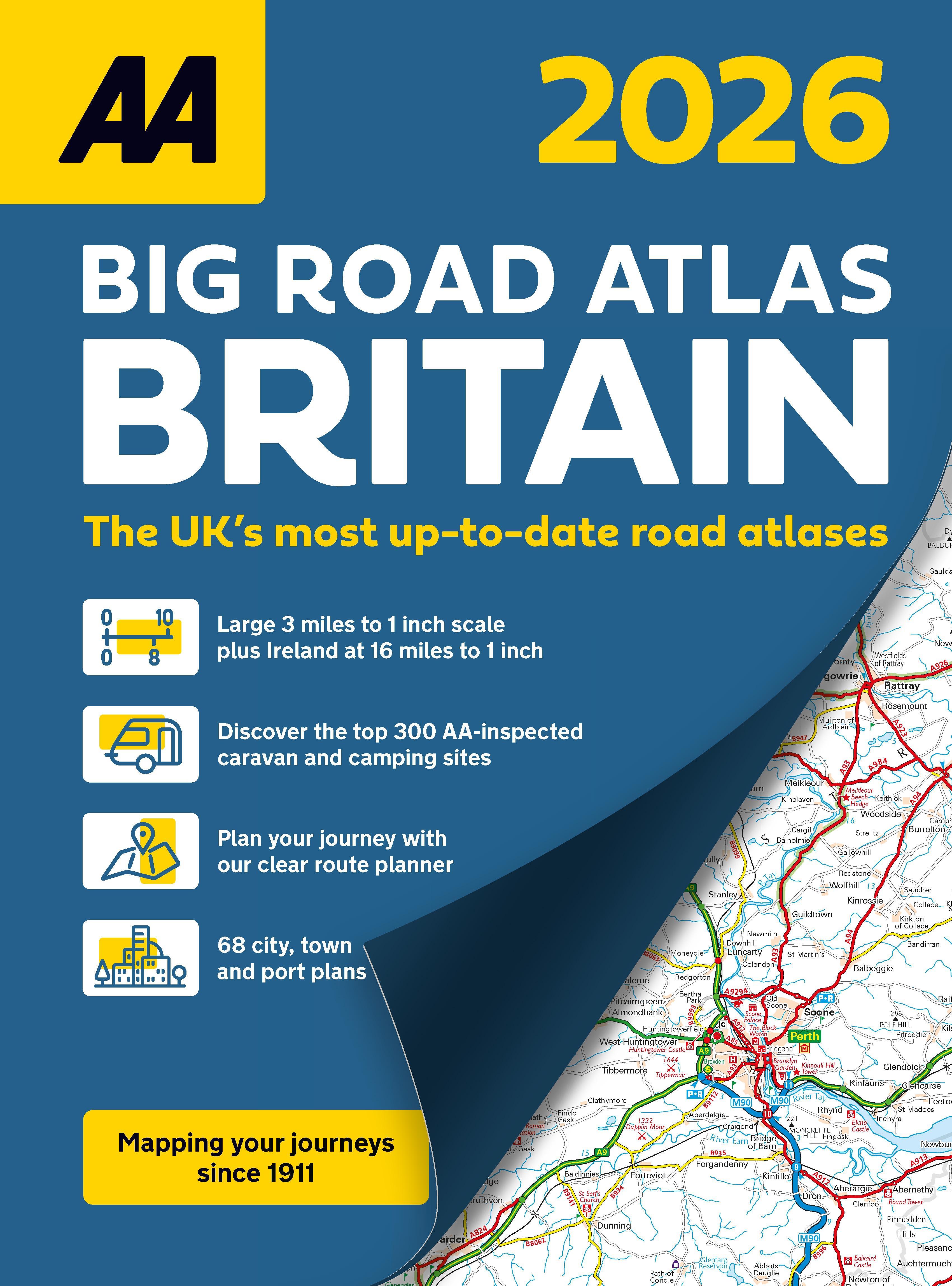 A3 format, large 3 miles to 1 inch scale including Ireland at 16 miles to 1 inch. Each page has been titled with its geographical location so you can turn to the page you need more easily. Wide minor roads (more than and less than 4m wide), National Trust, English and World Heritage sites, crematorium locations and other hard-to-find places are indicated on the mapping. There are 68 city, town and port plans including central London and a list of tourist sites with satnav friendly post codes. 4 page clear route planner map. Plus scenic routes, the top 300 AA inspected caravan and camping sites, over 1,800 golf courses and over 240 service areas.