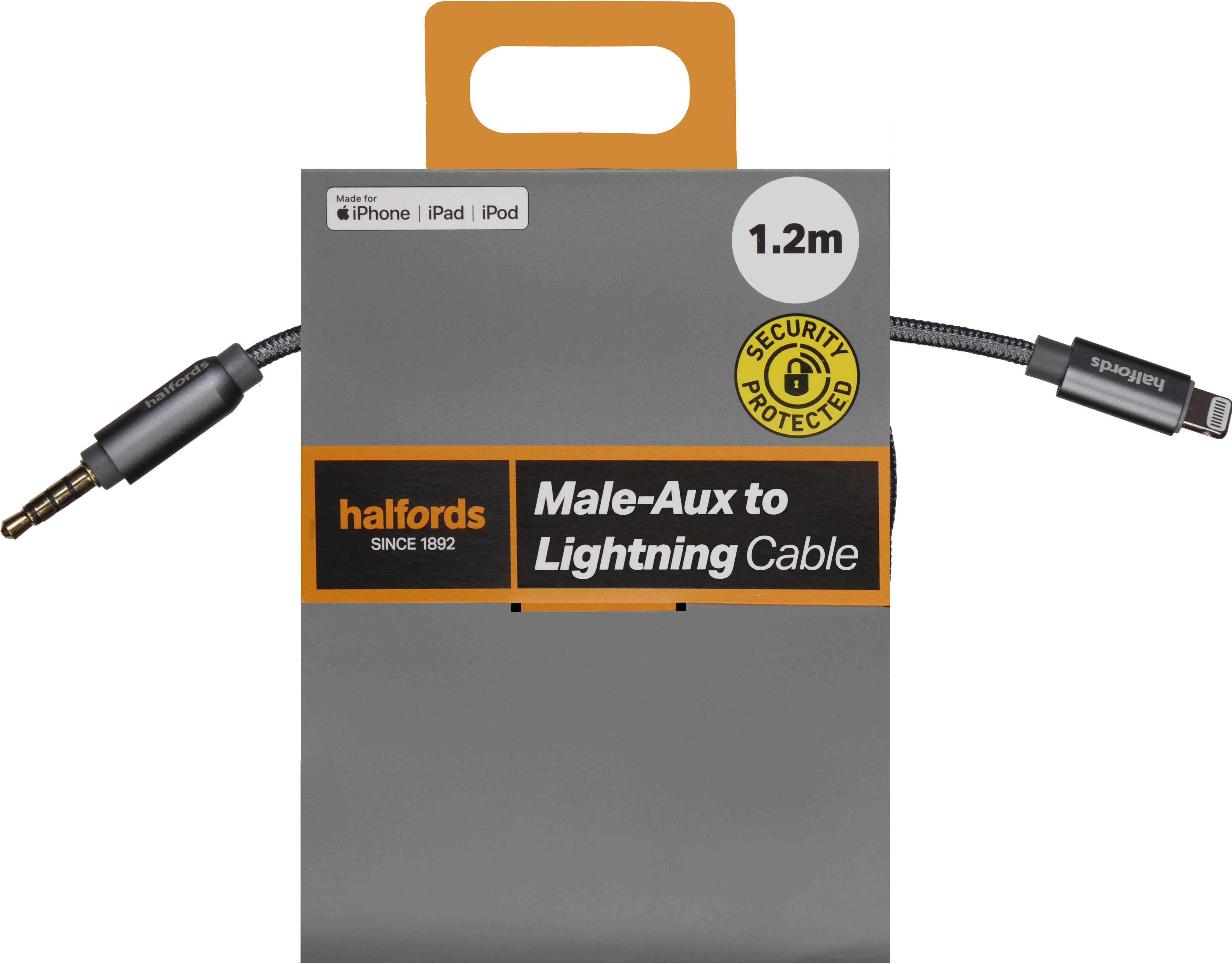 The Halfords 1.2m Aux to Lightning Audio Adapter (Charcoal) provides a simple and reliable way to connect your Apple devices to car or home audio systems. With a 1.2-metre cable, it allows seamless audio transfer from iPhones or iPads with a Lightning connector to any device with a standard aux input, delivering clear, high-quality sound for music, podcasts, or calls. Its durable design ensures long-lasting performance for all your audio needs.