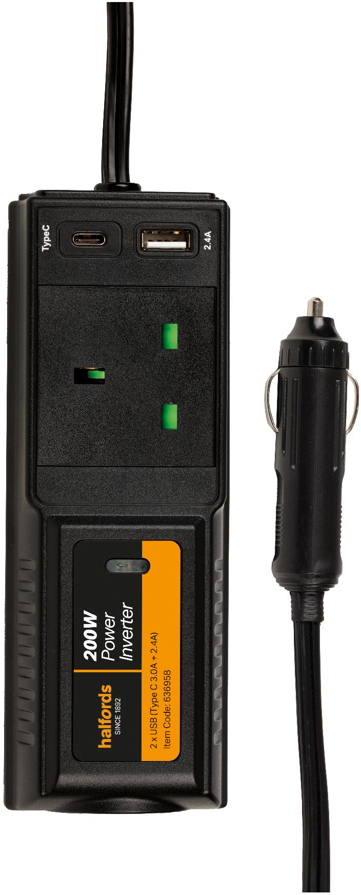 - Converts the low voltage 12V DC current from your car's battery or other power supply to a 230V AC current