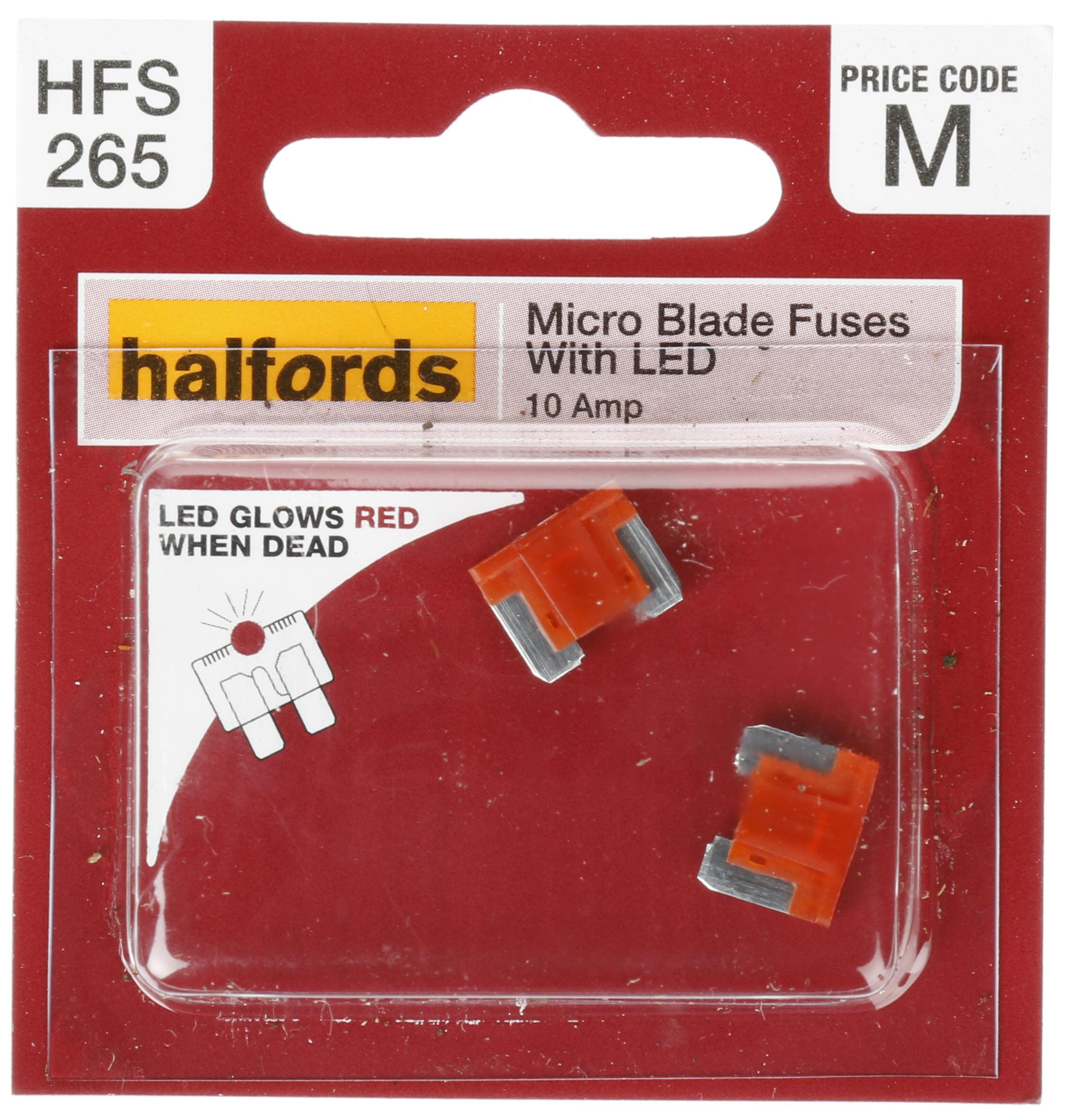 The Halfords Fuse Micro Blade LED 10 Amp (FUSE129) pack contains 2 x 10 Amp LED microblade fuses; Both come as 10.8mm x 8.7mm. The LED glows red when the fuse is blown.