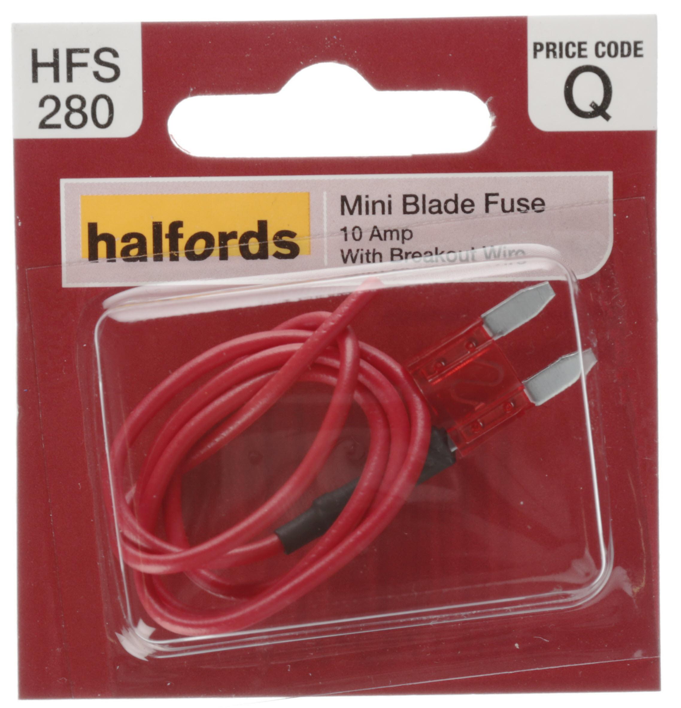The Halfords Mini Blade Fuse + Breakout Wire 10 Amp (FUSE159) contains 1 x 10 Amp mini blade fuse with a Breakout Wire.