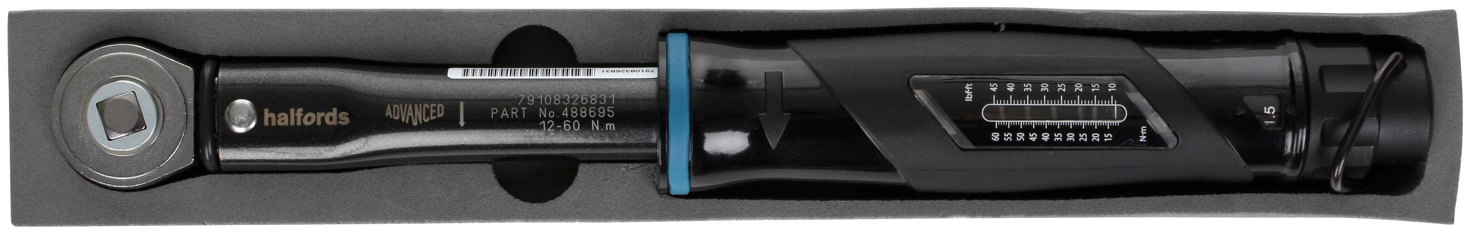 The Halfords Advanced Torque Wrench Model 60 is a professional quality torque wrench, accurate to +/-3% of reading, which meets the requirements of ISO 6789-1:2017.