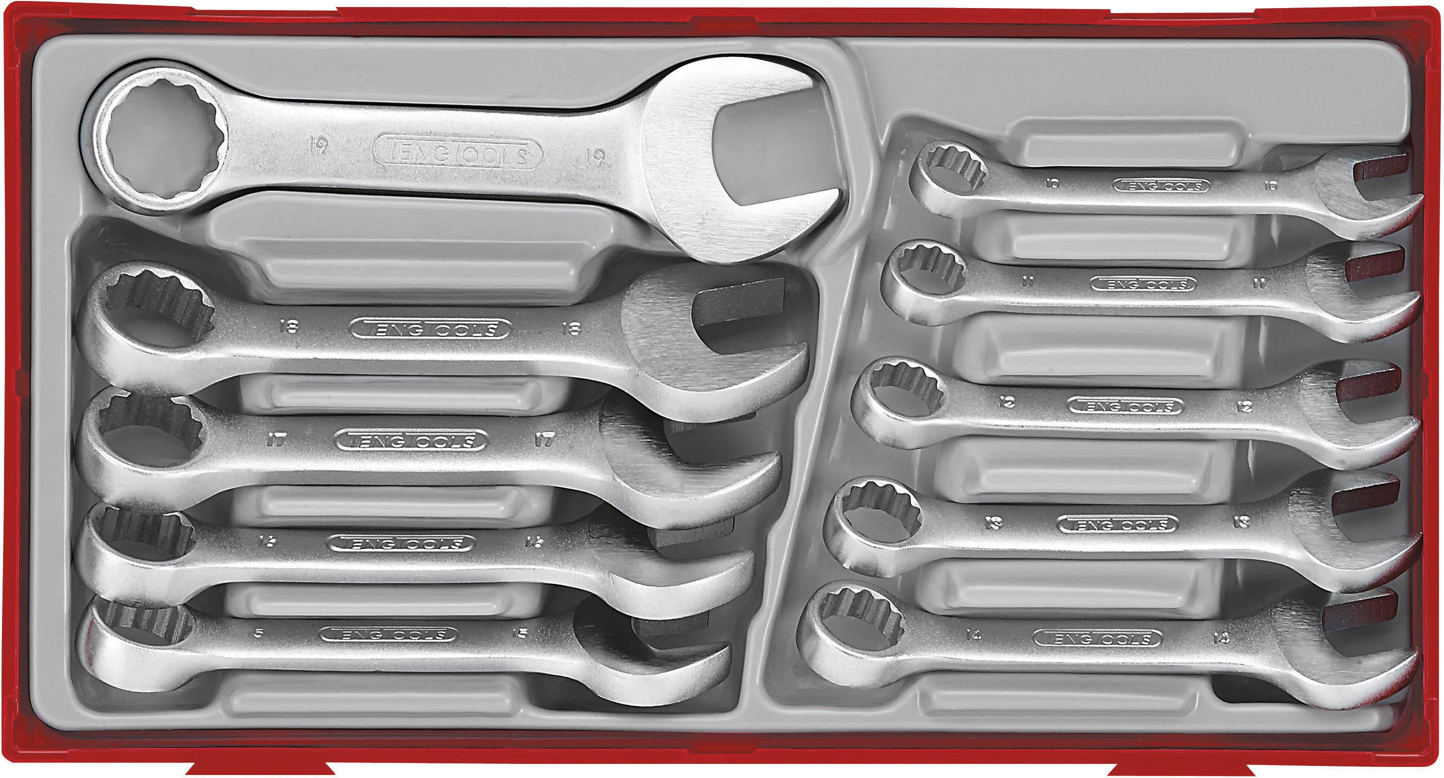 Short stubby spanners for use in confined spaces; Off set at 15° for easier use on flat surfaces; TengTools hip grip design for contact with the flat side of the fastening; Chrome vanadium satin finish; Designed and manufactured to DIN3113A;Organised in a tool tray module size 1 (TT1).